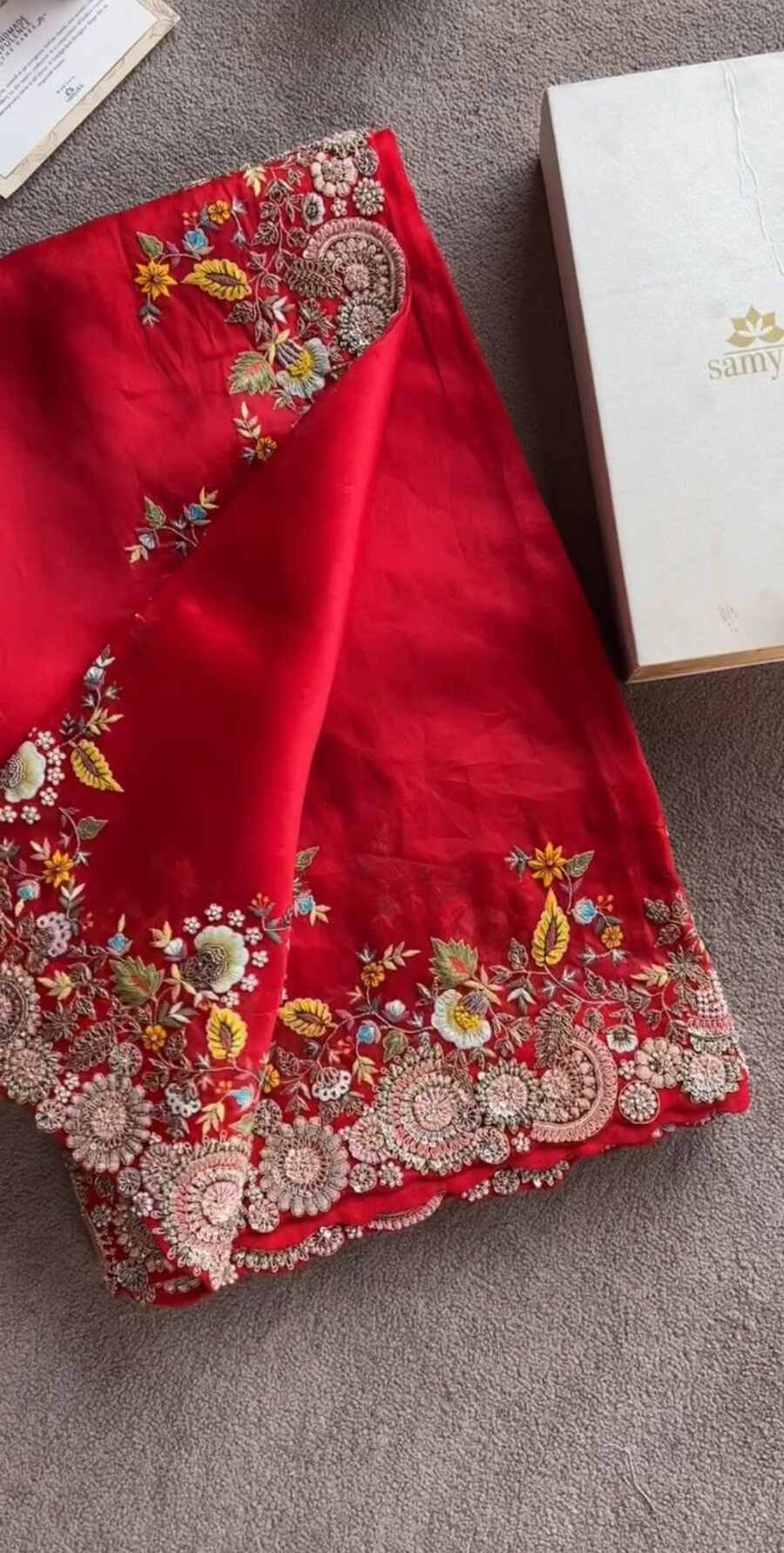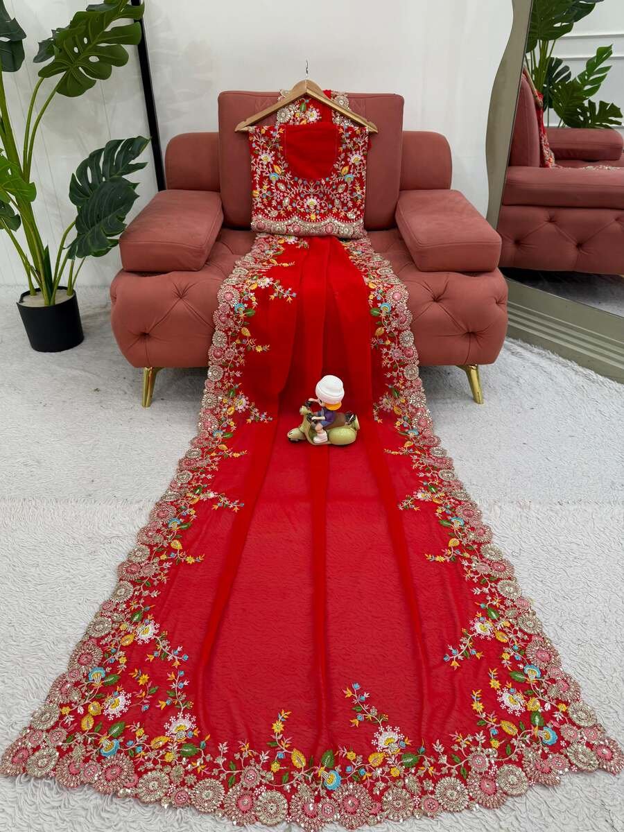 DESIGNER GEORGETTE THREAD AND SEQUENCE WORK SAREE WITH UNSTITCHED BLOUSE RED