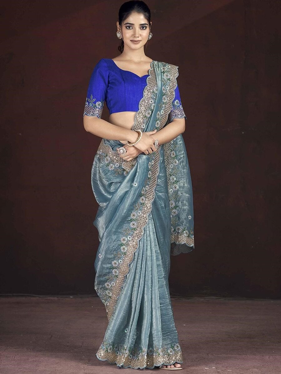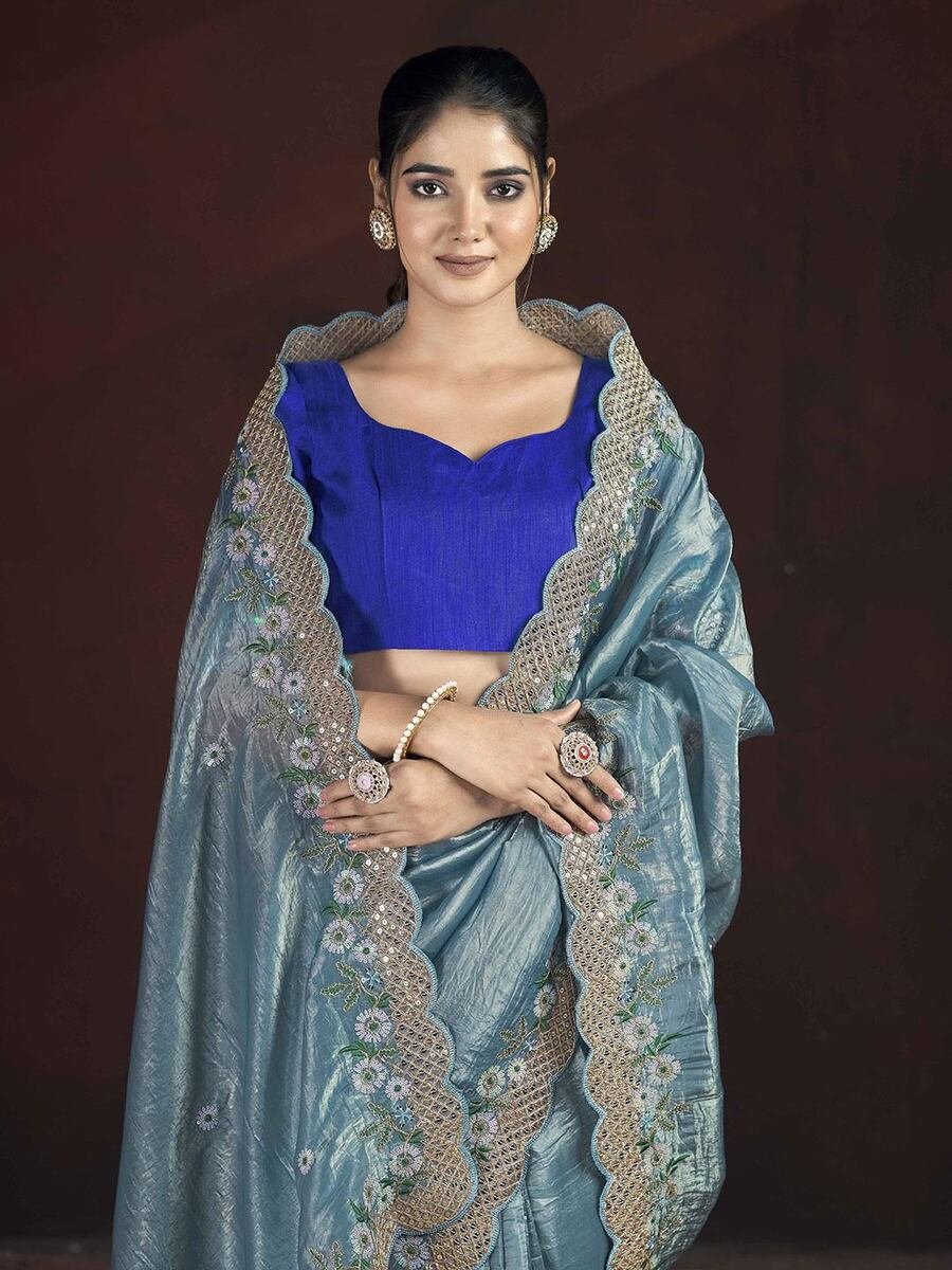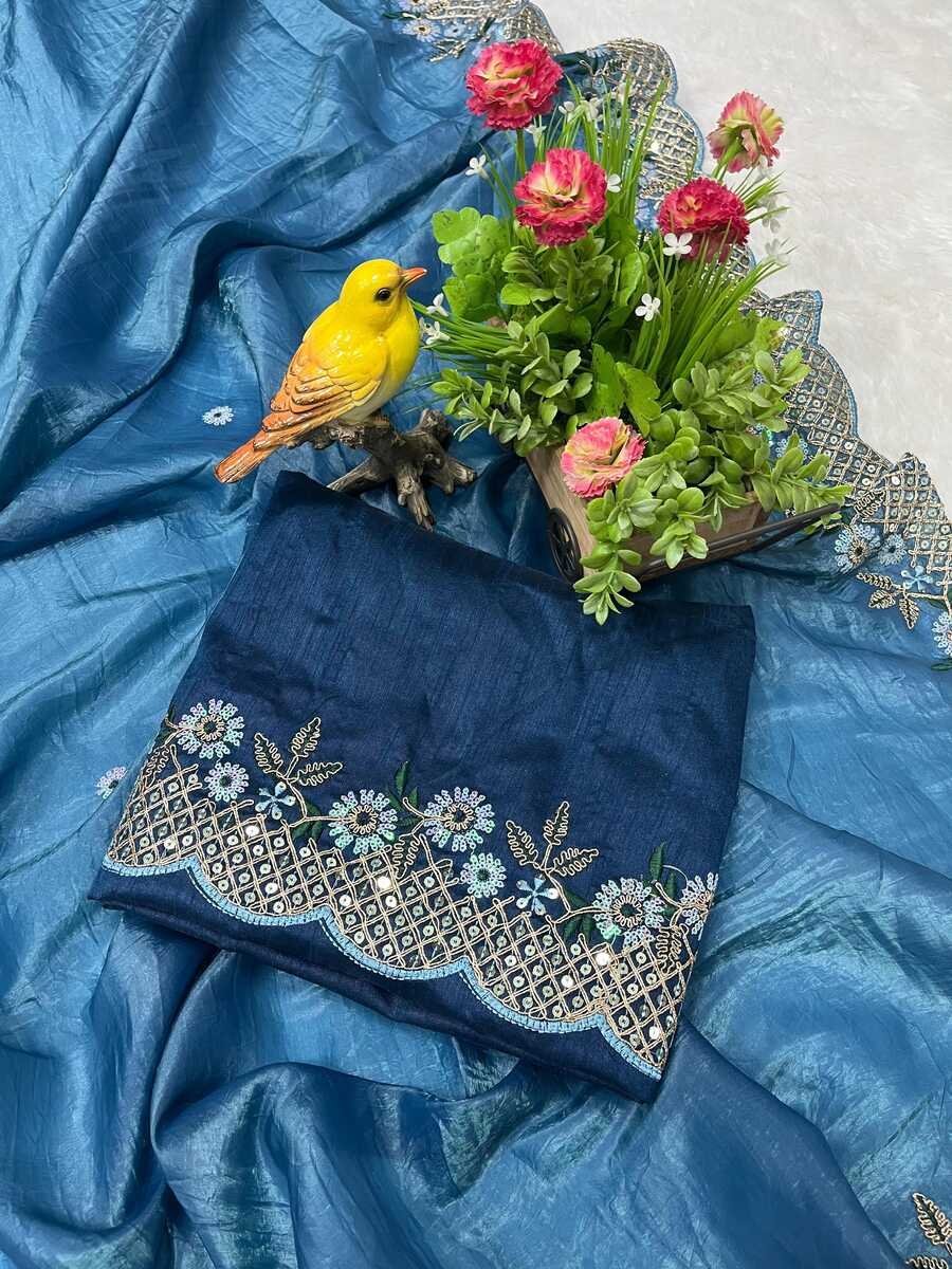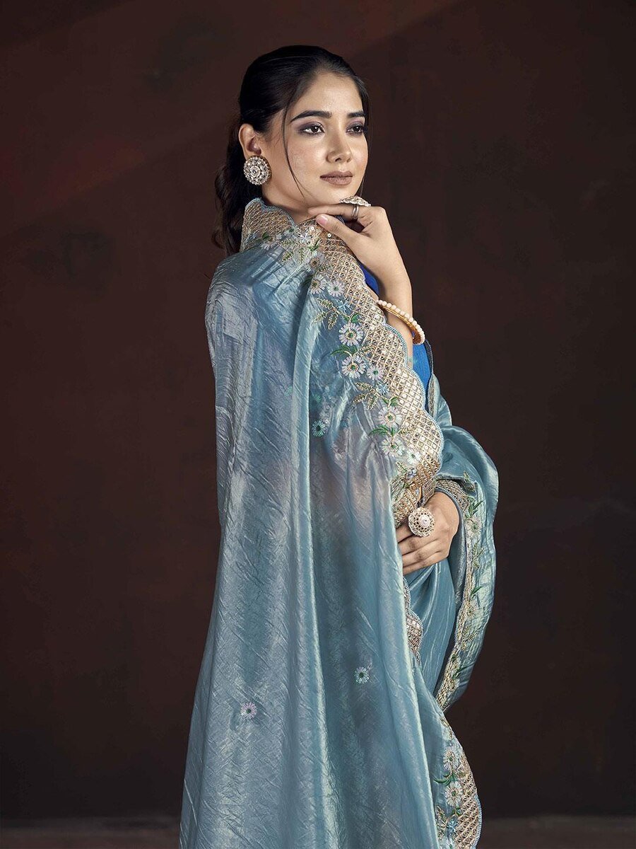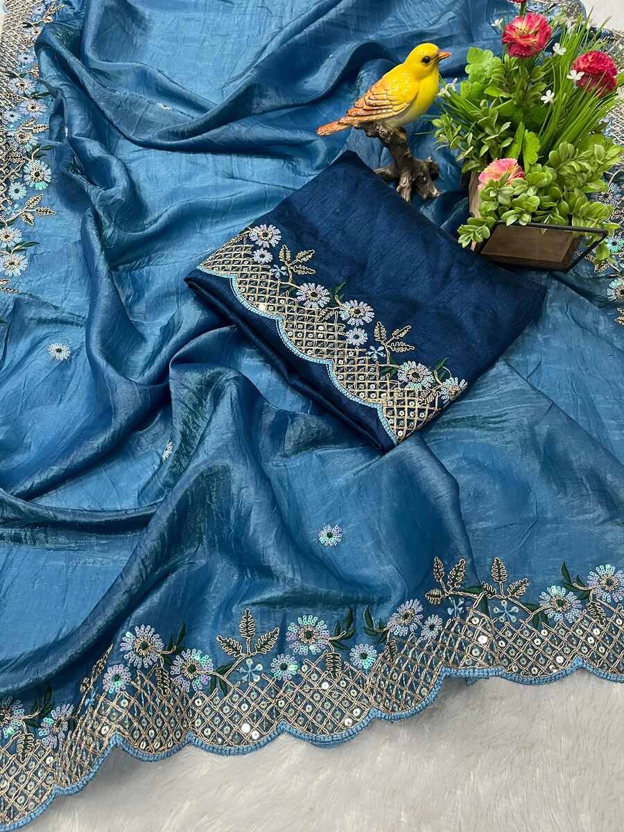 DESIGNER GOLD CRUNCHY EMBROIDERED WORK OF MULTI THREAD SEQUENCE WITH CUTWORK BORDER SAREE WITH UNSTITCHED BLOUSE SKY