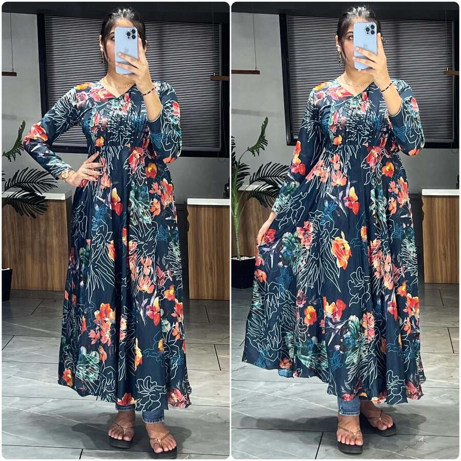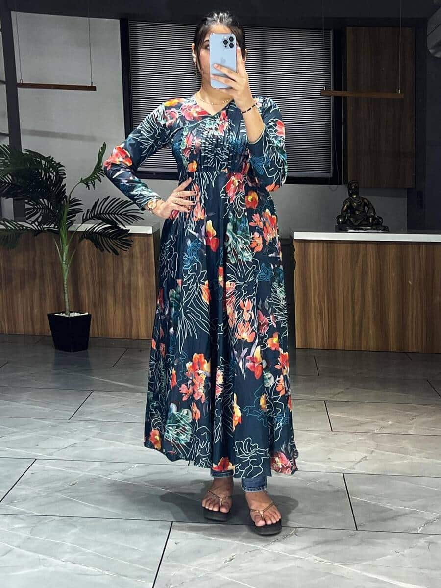 DESIGNER HEAVY CHINON FLORAL PRINTED GOWN NAVY BLUE