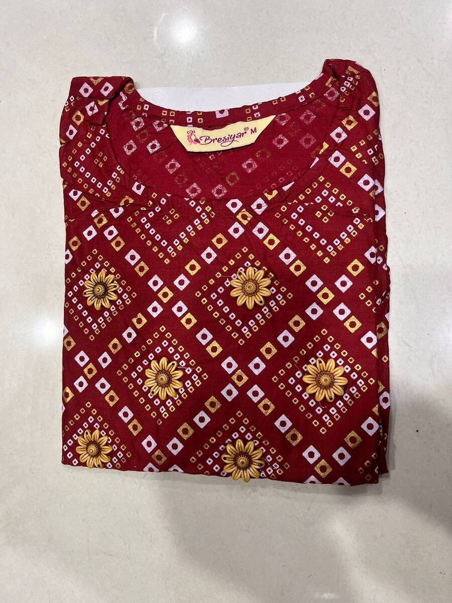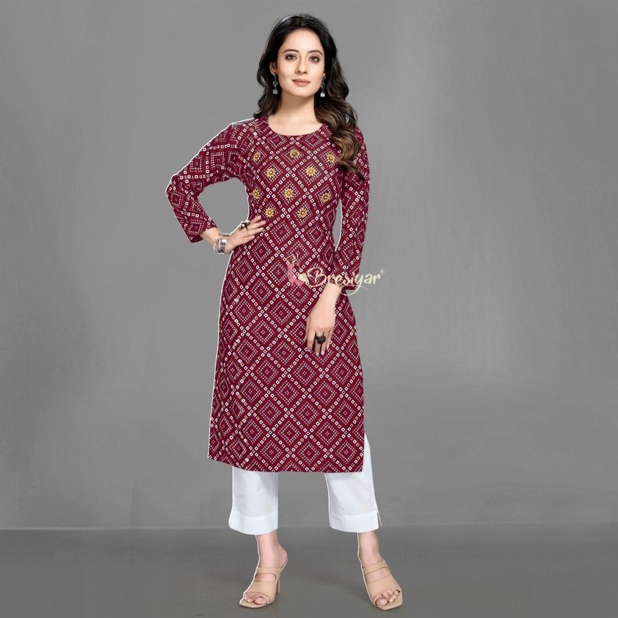 DESIGNER HEAVY RAYON BADHANI PRINT WORK READY TO WEAR ONLY KURTI MAROON