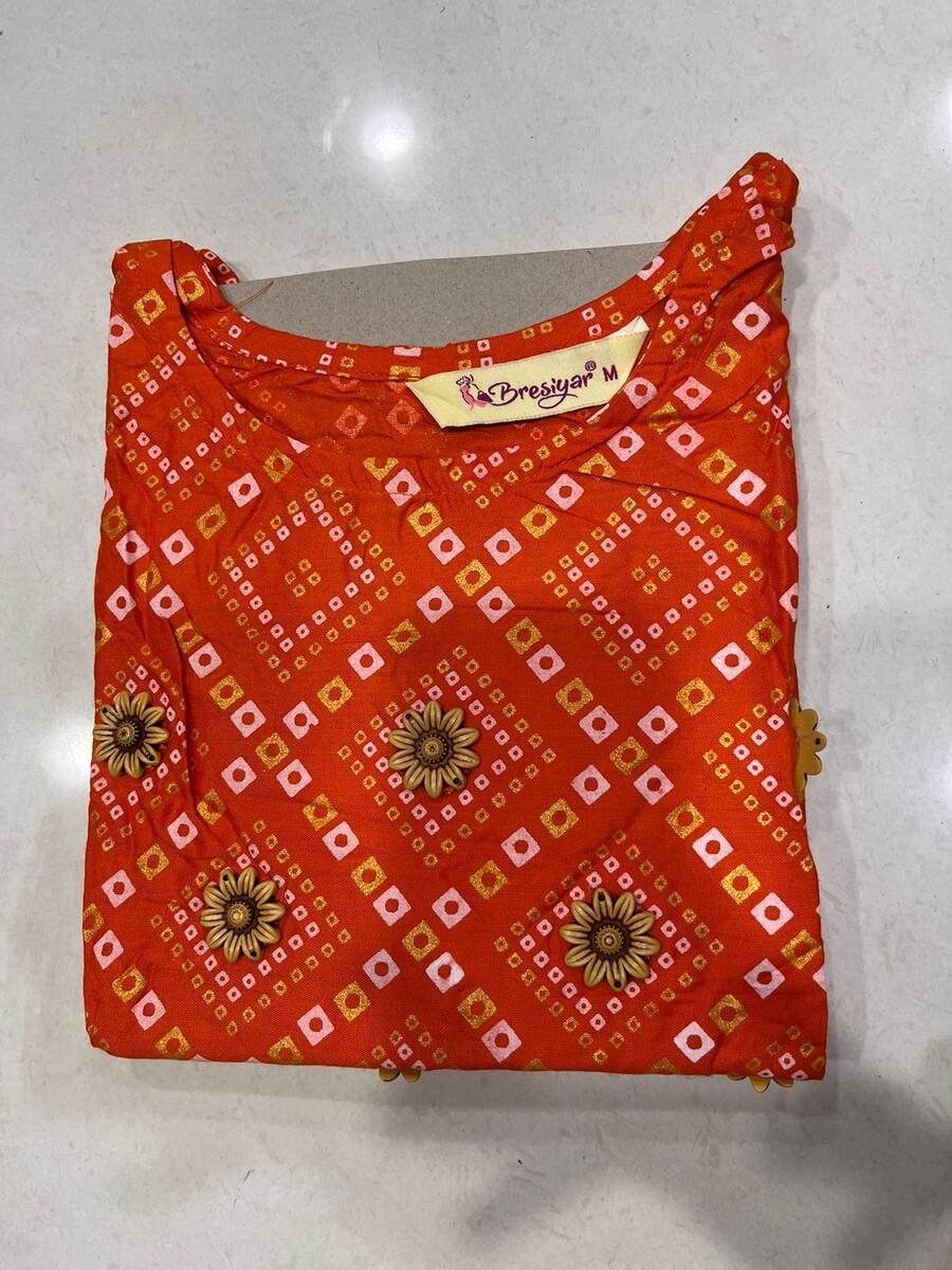 DESIGNER HEAVY RAYON BADHANI PRINT WORK READY TO WEAR ONLY KURTI ORANGE