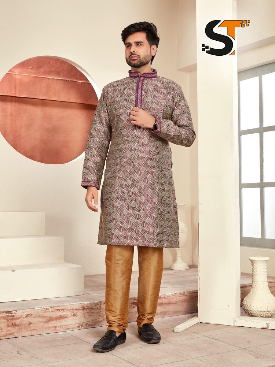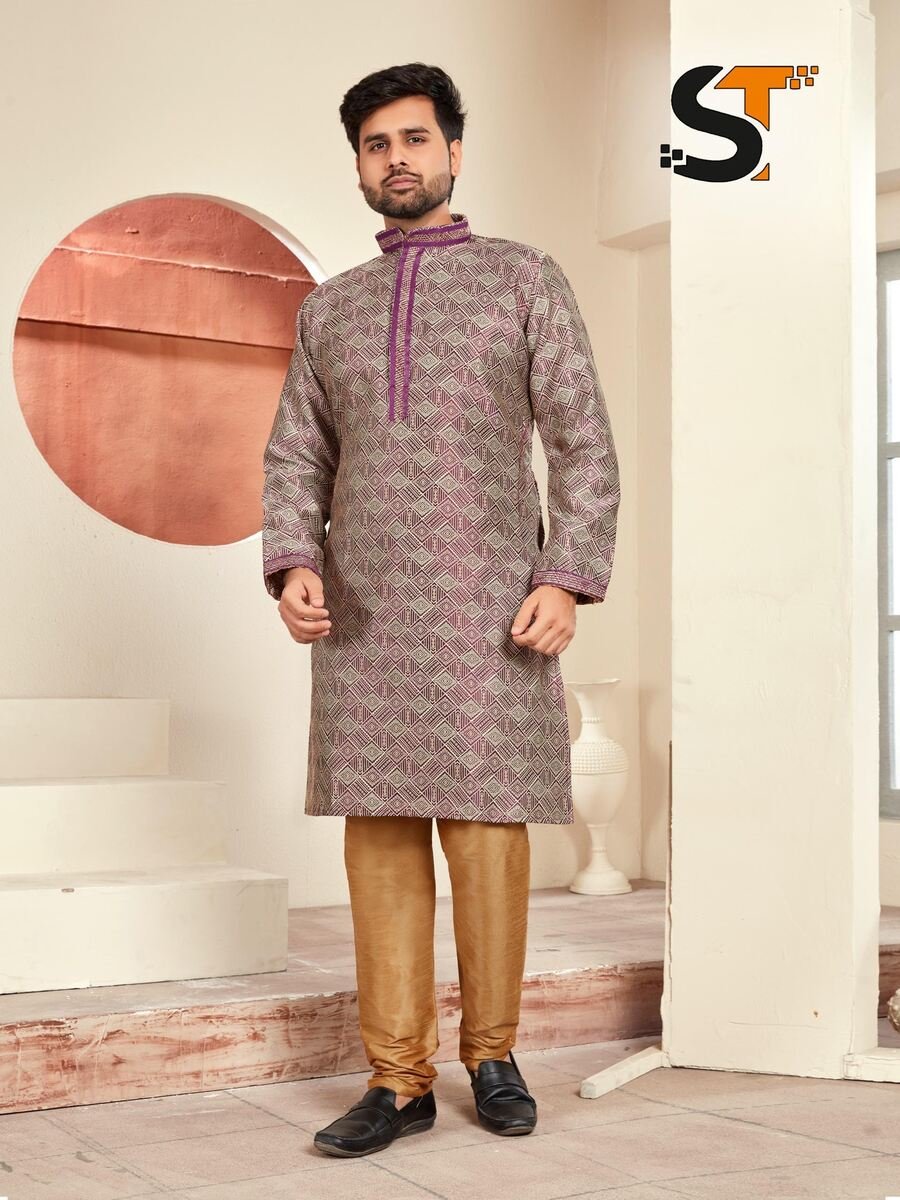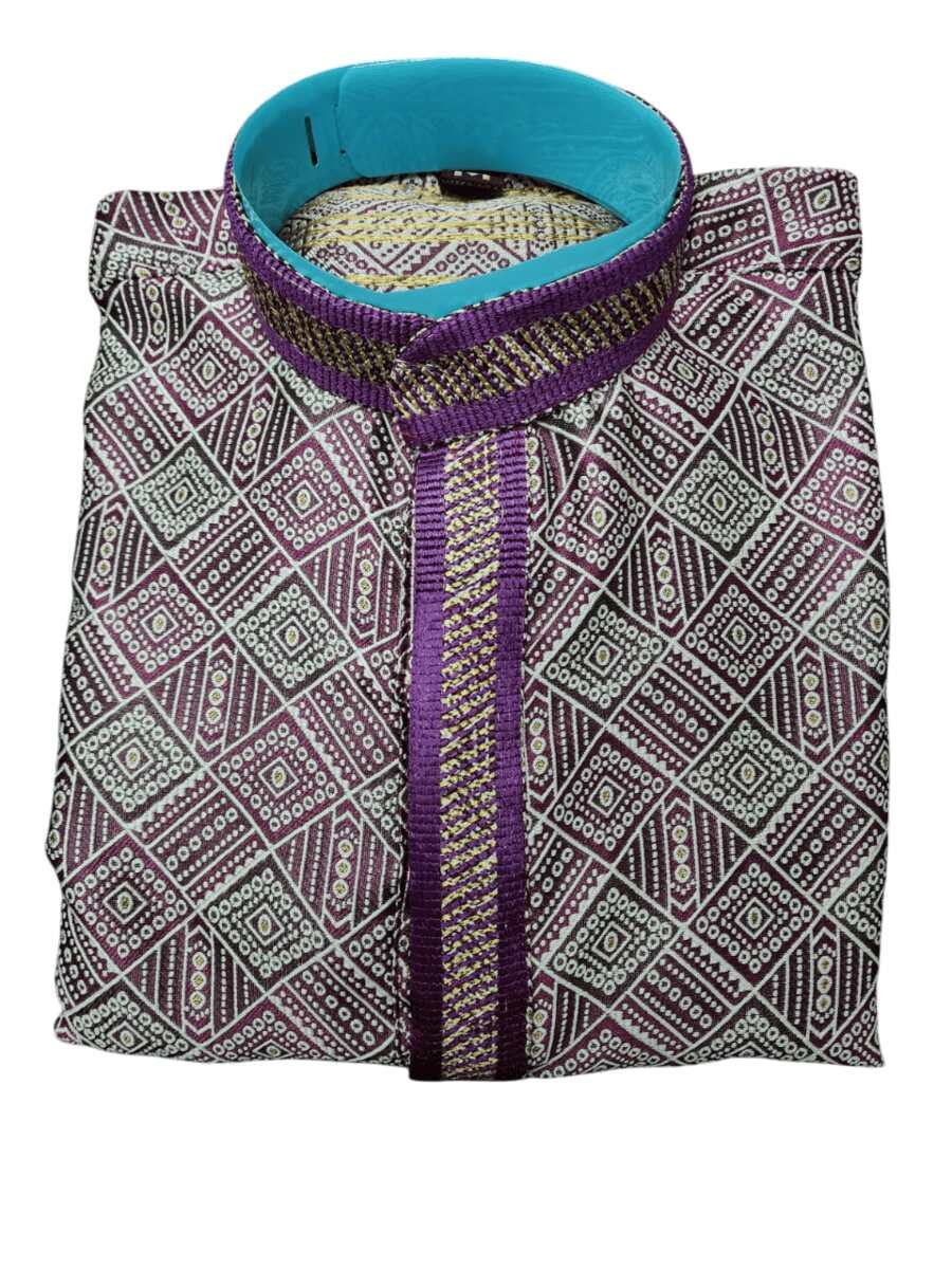 DESIGNER JACQUARD PRINTED AND LACE WORK MEN’S KURTA PAYJAMA PURPLE