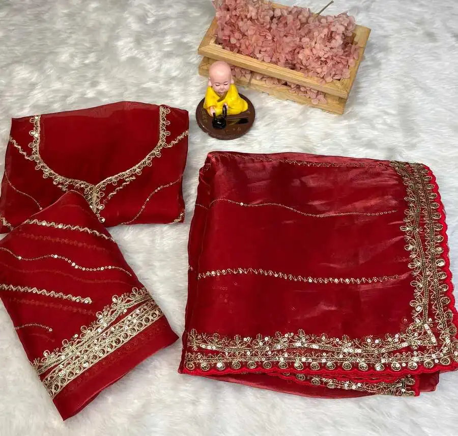 DESIGNER JIMMY CHOO SEQUENCE ZARI WORK AARCO BORDER WORK SAREE WITH UNSTITCHED BLOUSE RED