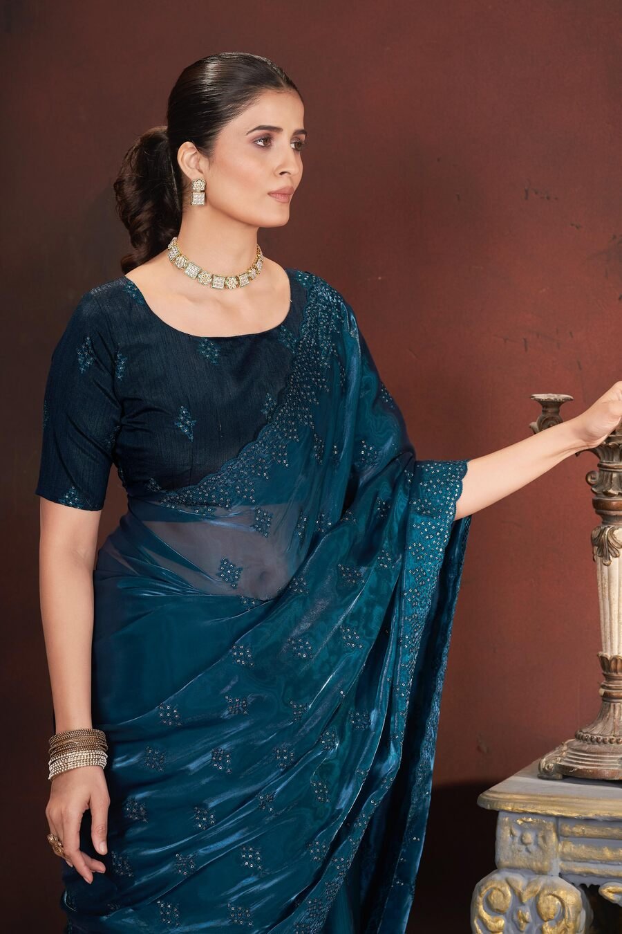 DESIGNER JIMMY CHOO SILK SEQUENCE WORK WITH CROSS STITCH EMBROIDERY & CUTWORK BORDER SAREE WITH UNSTITCHED BLOUSE TEAL