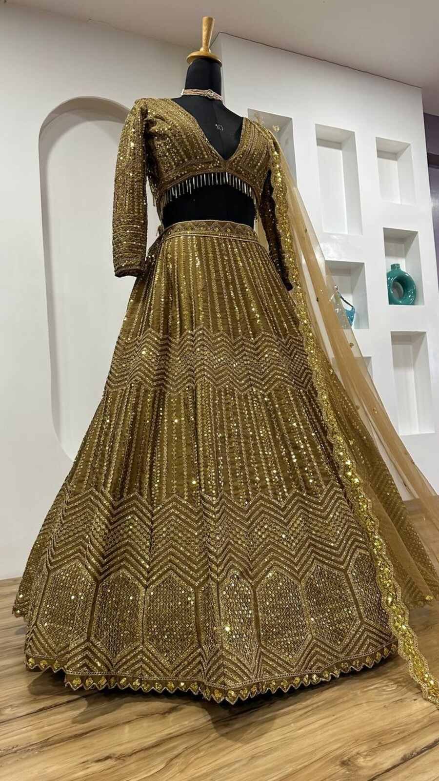 DESIGNER KASTURI SILK GEORGETTE SEQUENCE, & DORI WORK LEHENGA CHOLI WITH DUPATTA GOLD