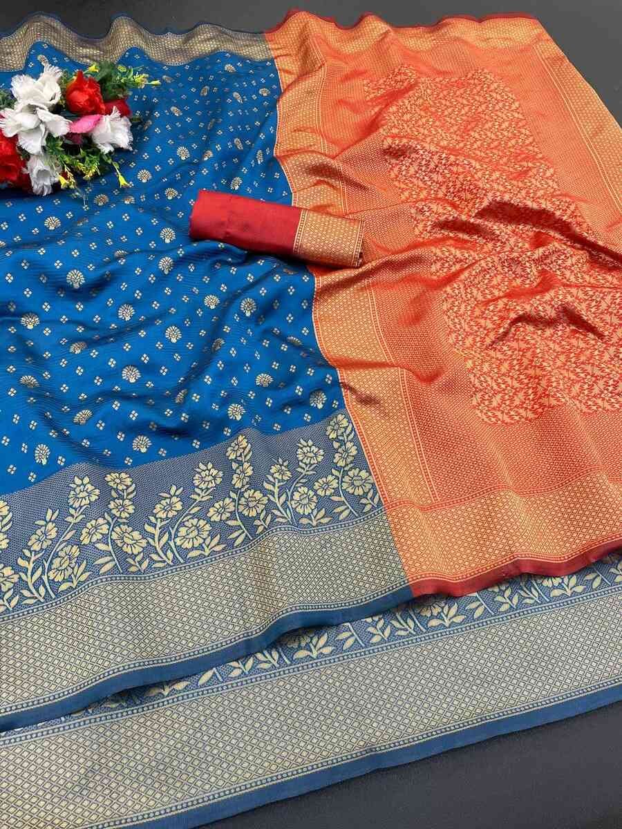 DESIGNER LICHI WORK WEAVING WORK SAREE WITH UNSTITCHED BLOUSE BLUE