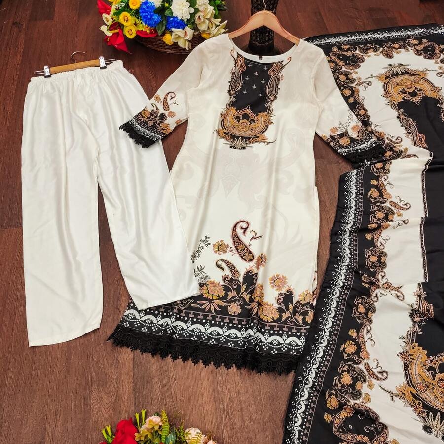 DESIGNER MASLIN DIGITAL PRINTED TOP BOTTOM WITH DUPATTA WHITE