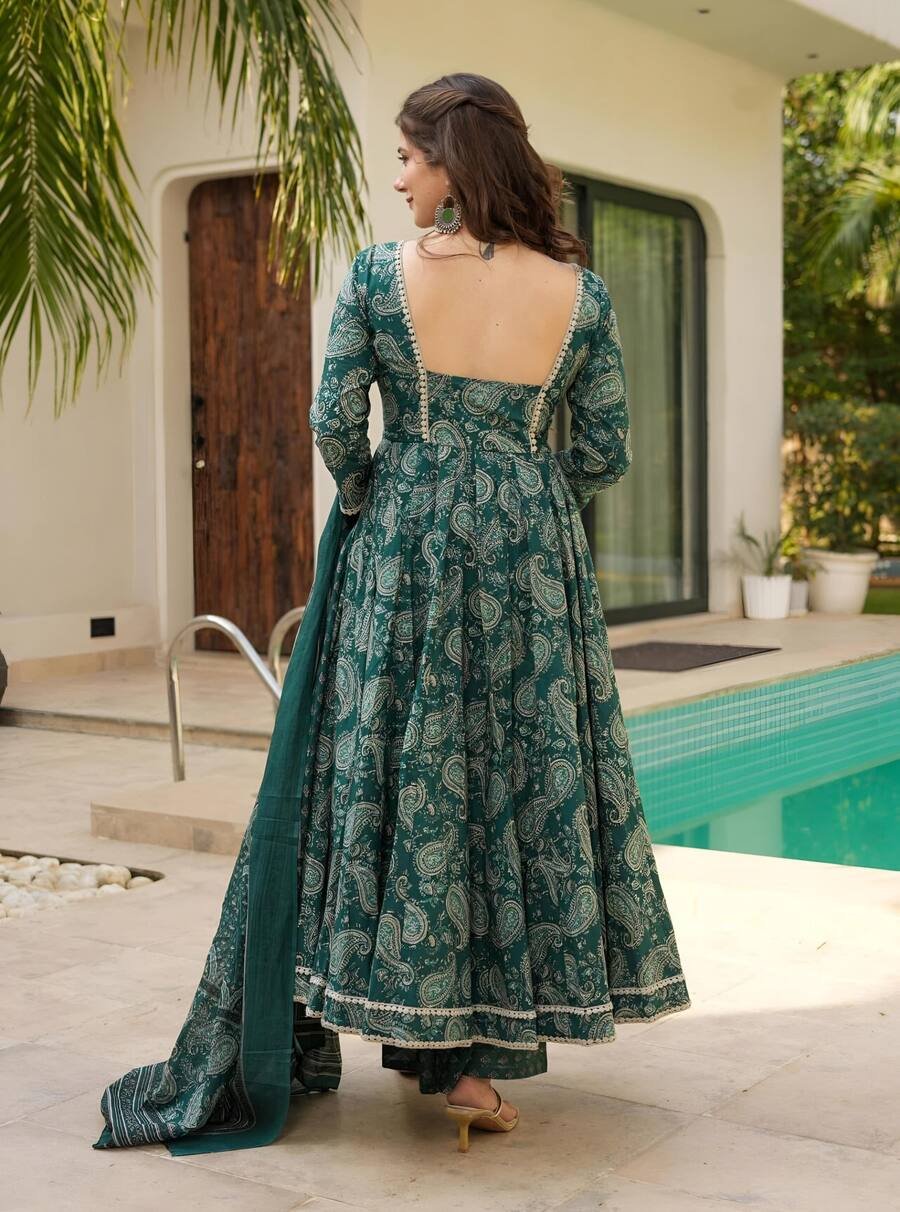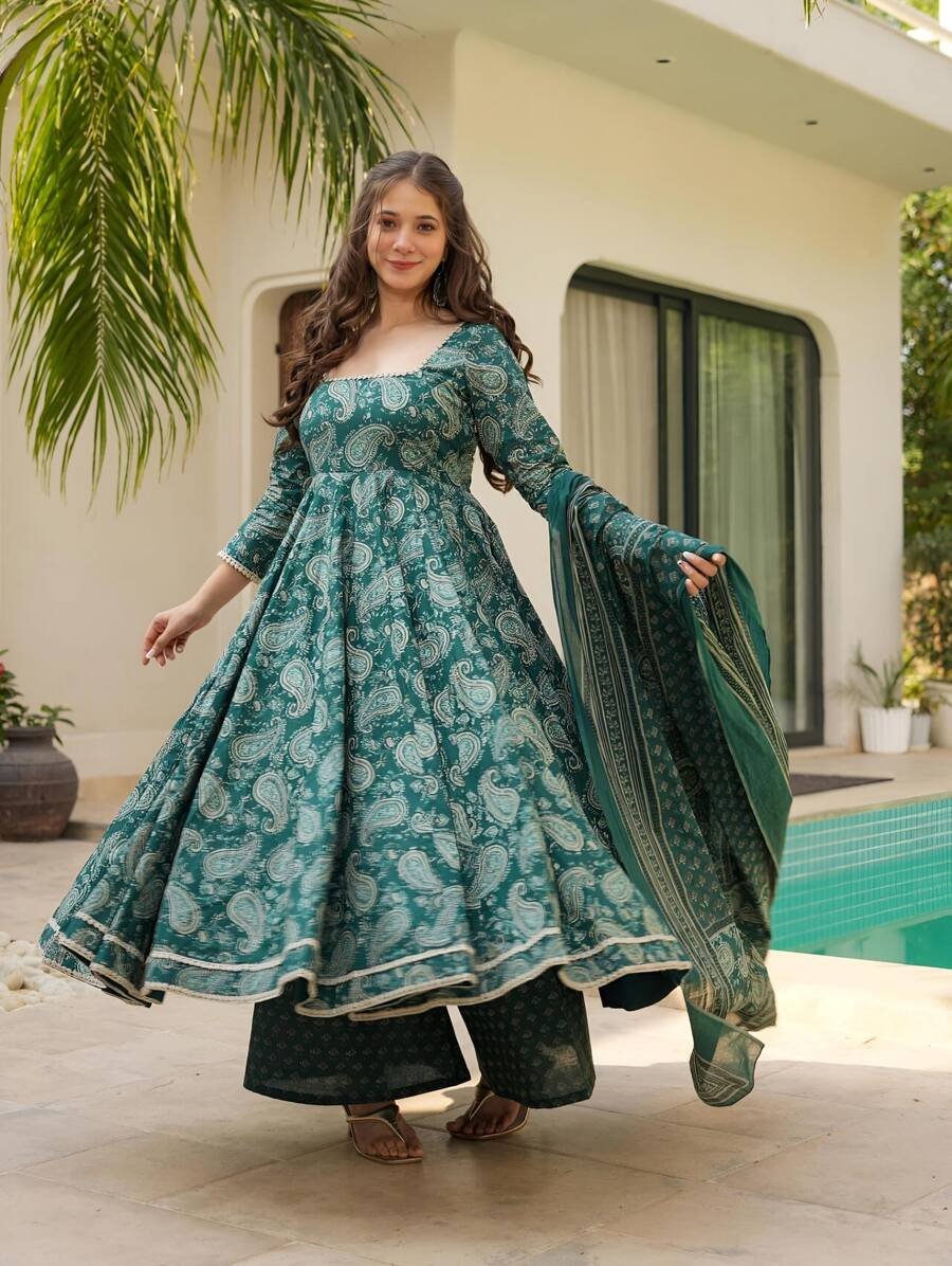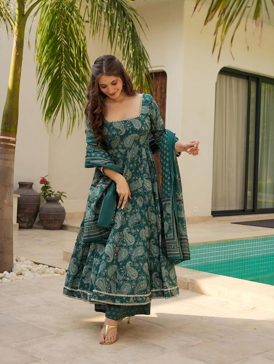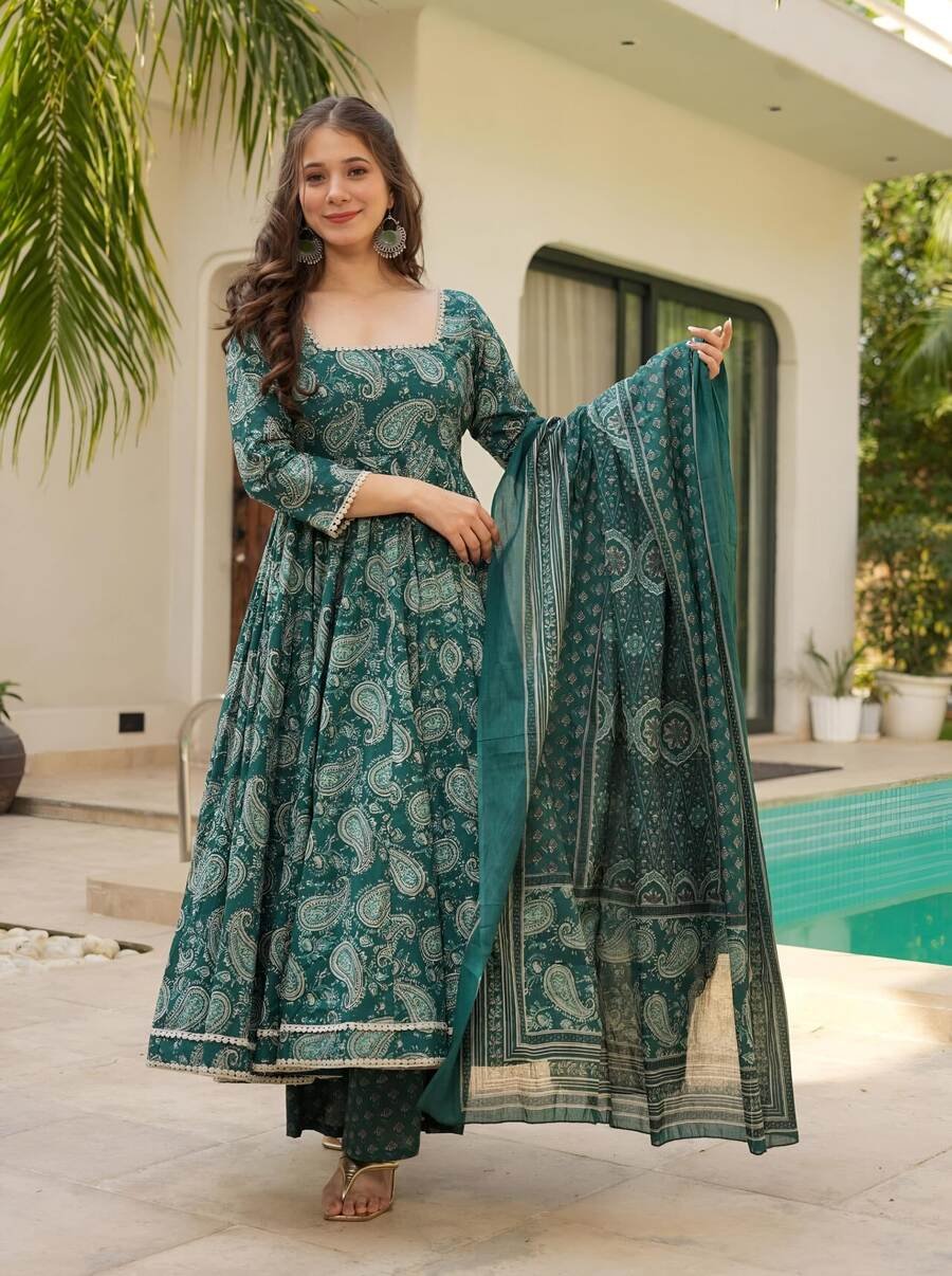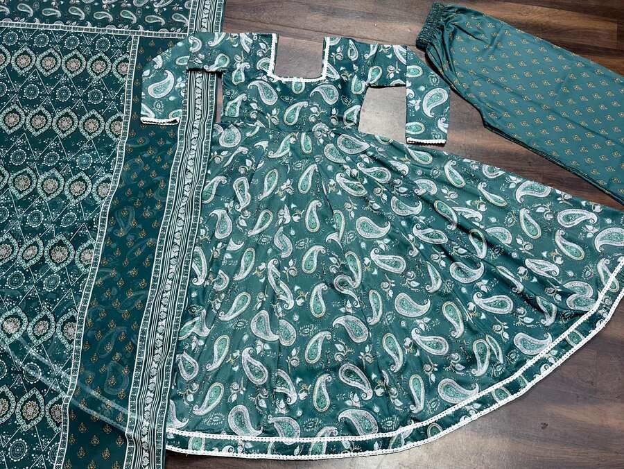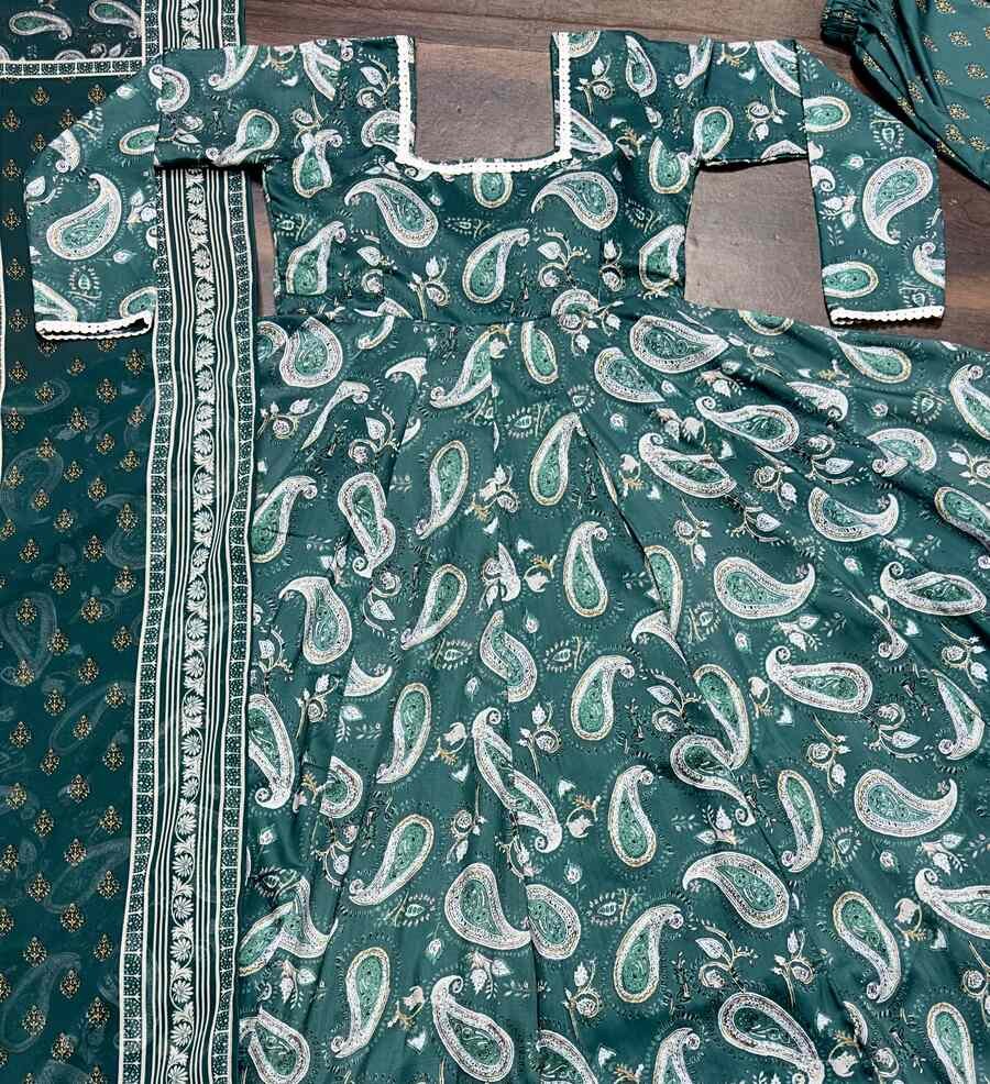 DESIGNER MUSLIN DIGITAL PRINT WITH WHITE EMBROIDERY LACE WORK GOWN BOTTOM WITH DUPATTA GREEN