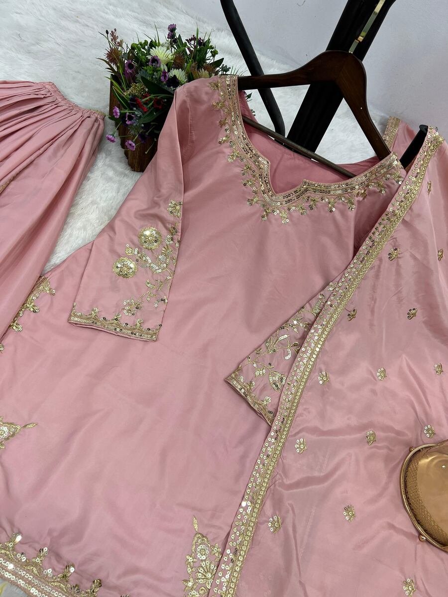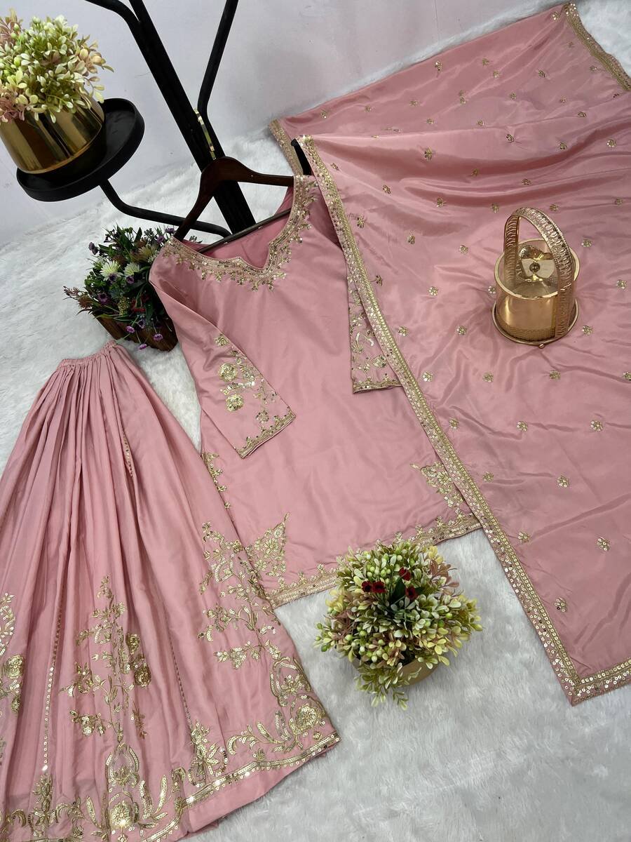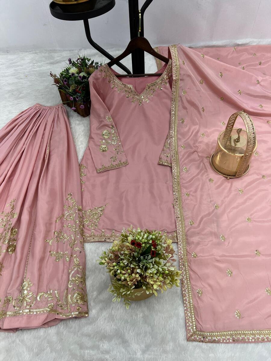 DESIGNER NATURAL CREPE EMBROIDERY SEQUENCE WORK TOP PALAZZO WITH DUPATTA BABY PINK