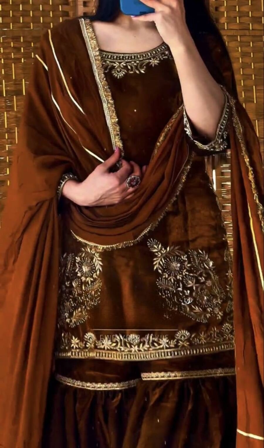 DESIGNER NATURAL CREPE SEQUENCE EMBROIDERY WORK TOP SHARARA WITH DUPATTA CHIKU
