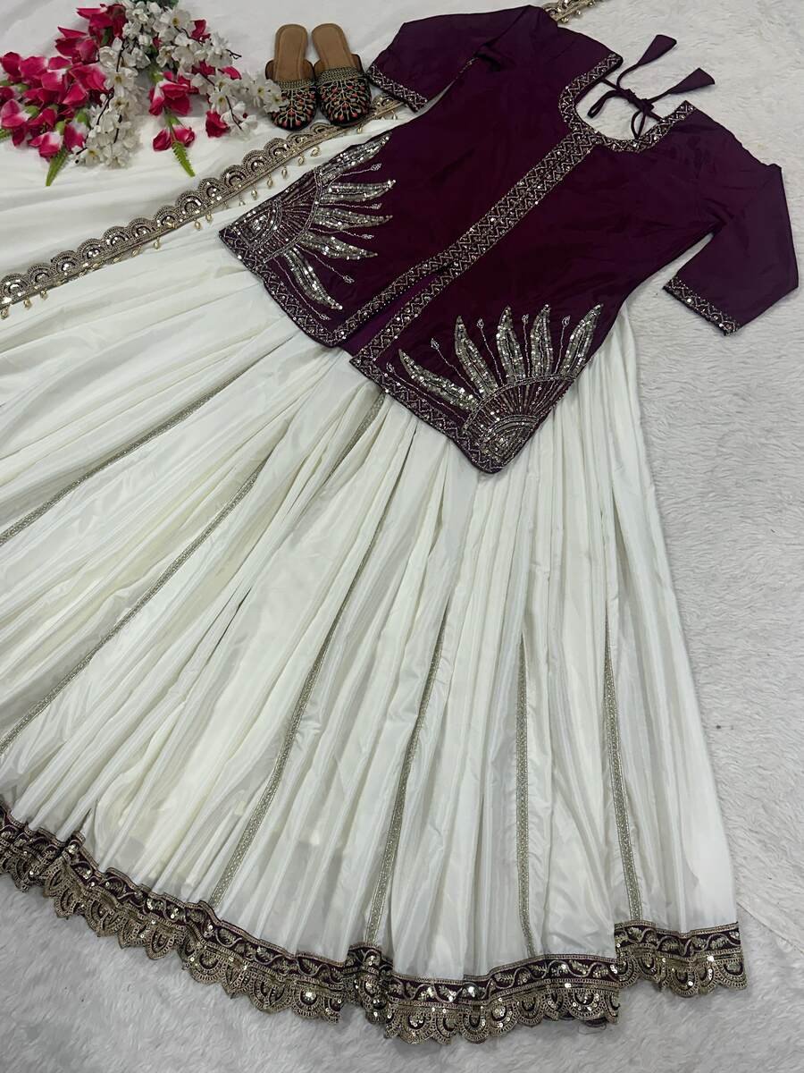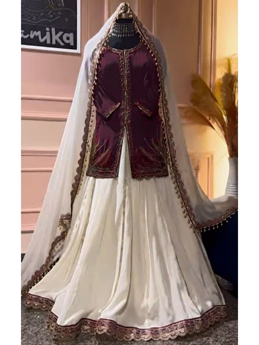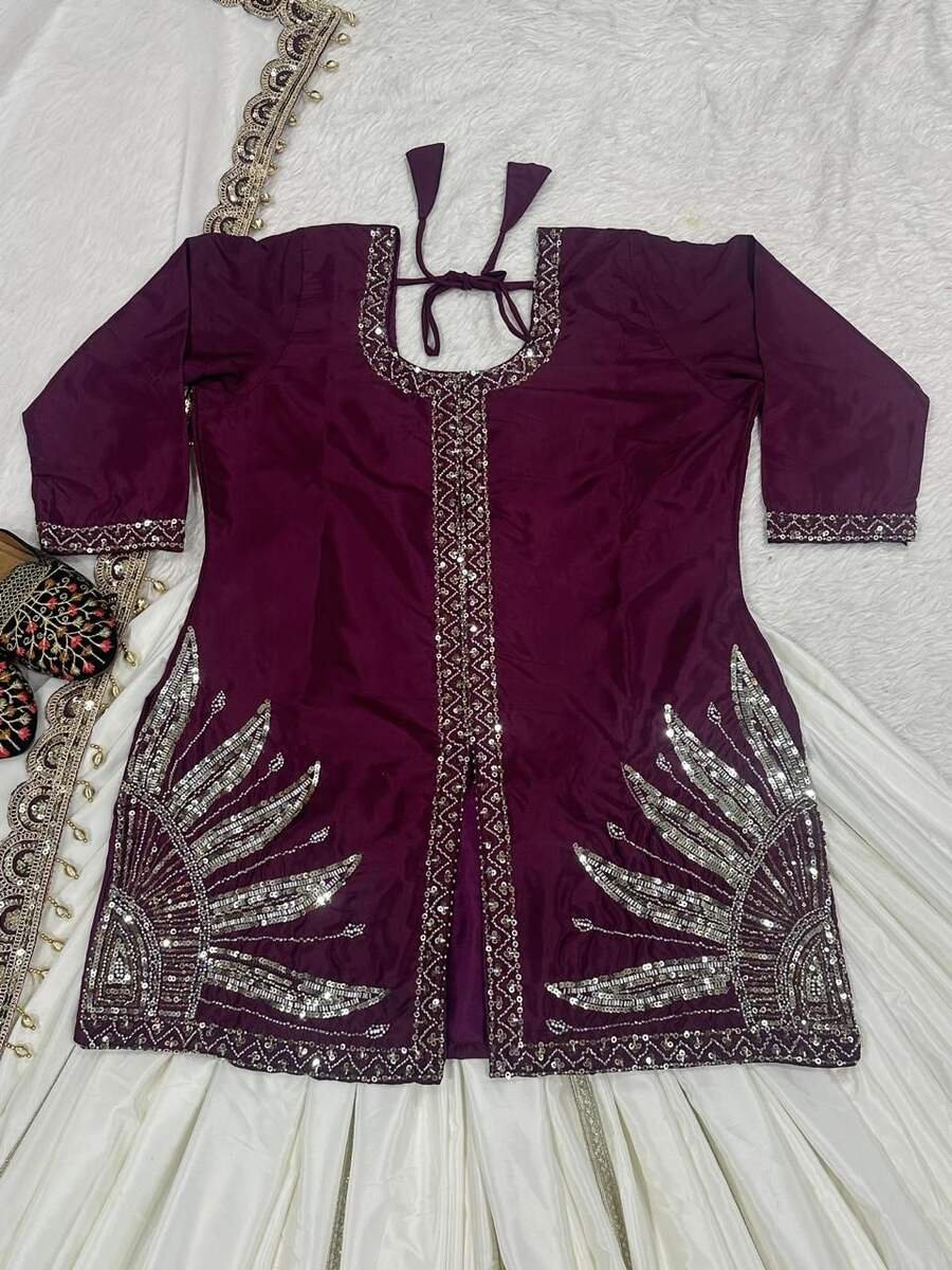 DESIGNER NATURAL CREPE SILK EMBROIDERY SEQUENCE BEADS HANDWORK TOP LEHENGA WITH DUPATTA WINE