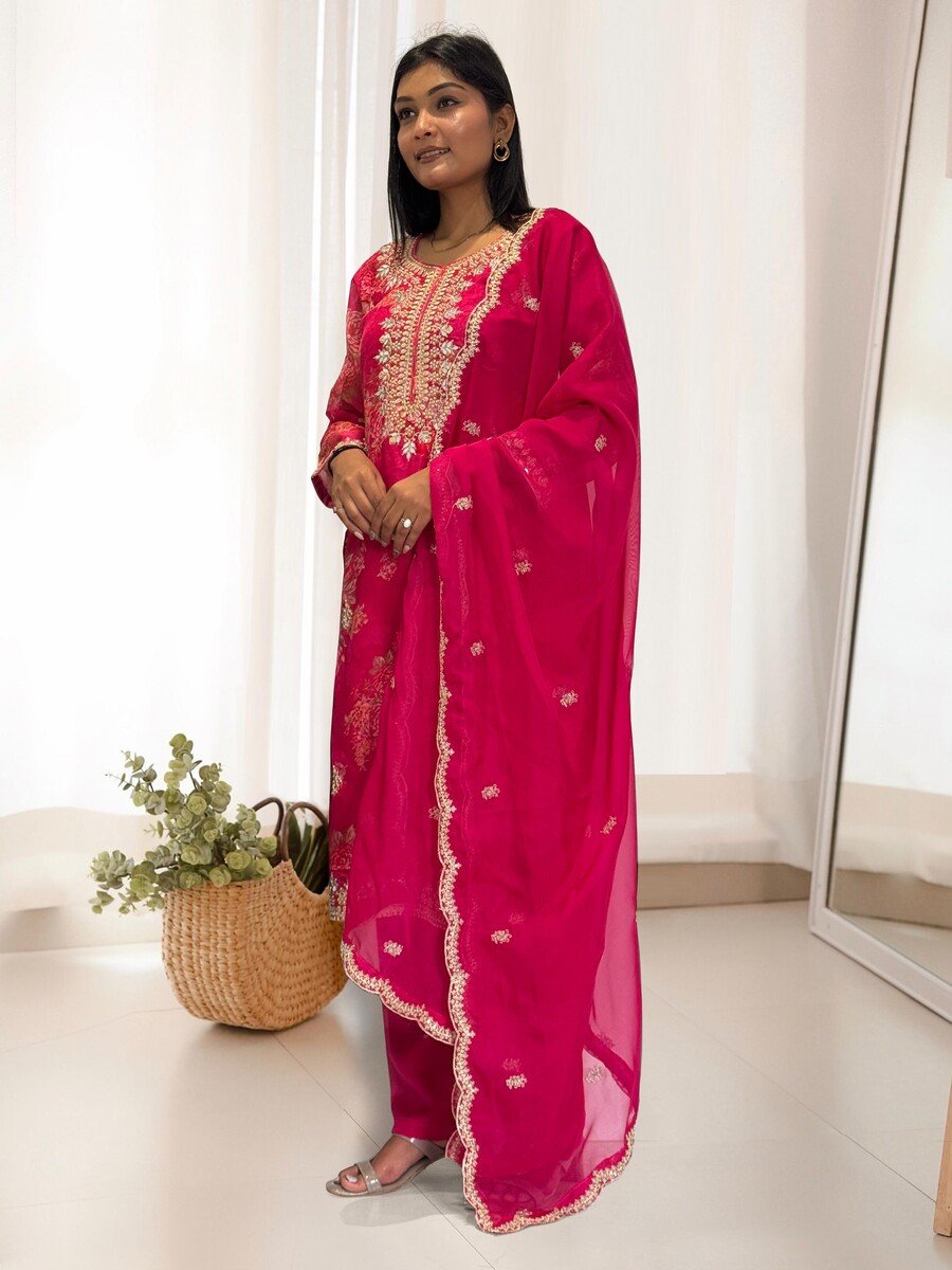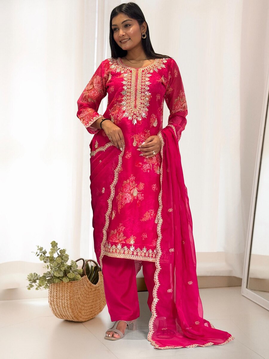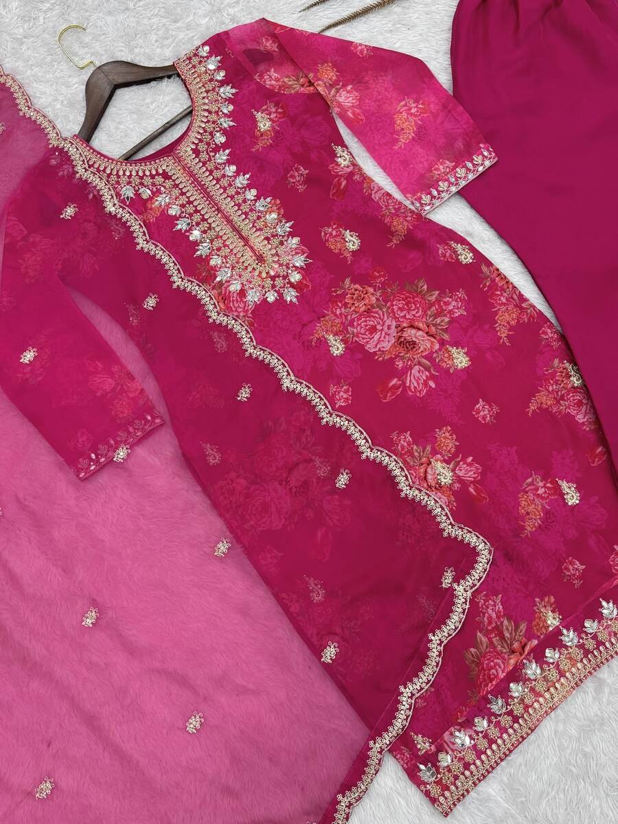 DESIGNER ORGANZA DIGITAL PRINTED EMBROIDERY CODING SEQUENCE WORK TOP BOTTOM WITH DUPATTA RANI