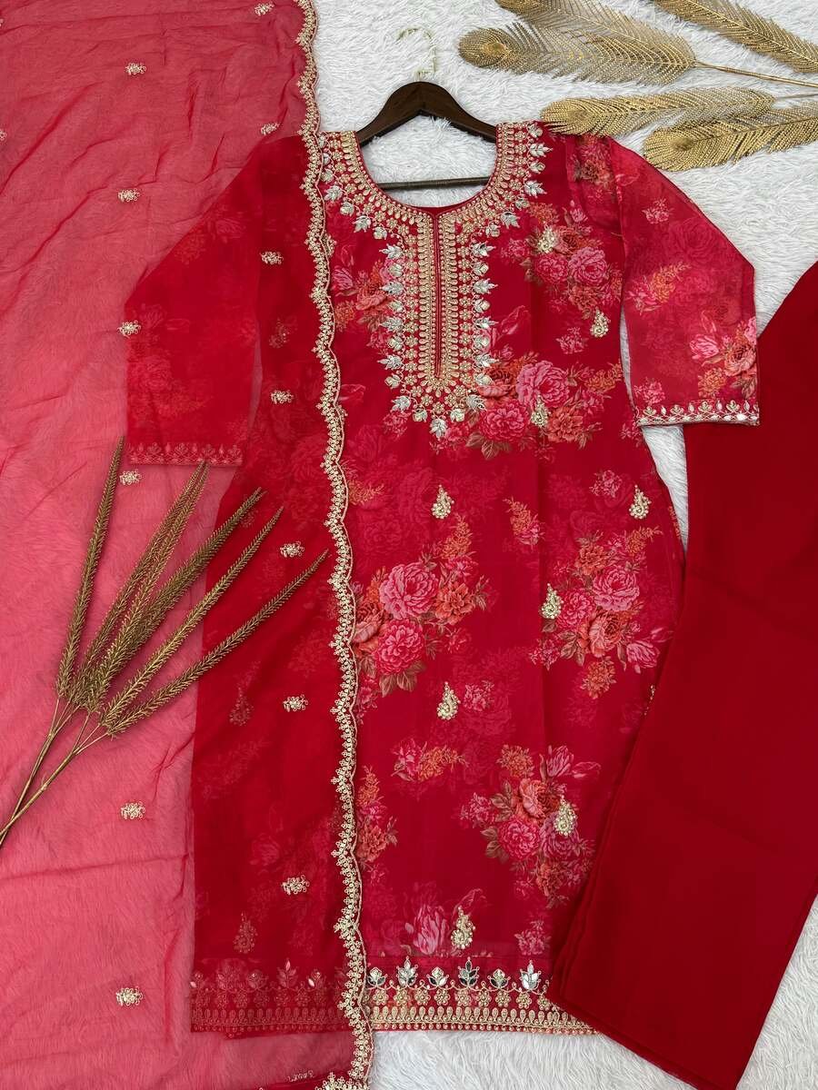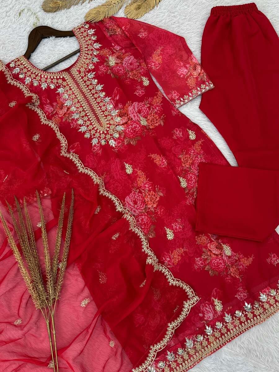 DESIGNER ORGANZA DIGITAL PRINTED EMBROIDERY CODING SEQUENCE WORK TOP BOTTOM WITH DUPATTA RED