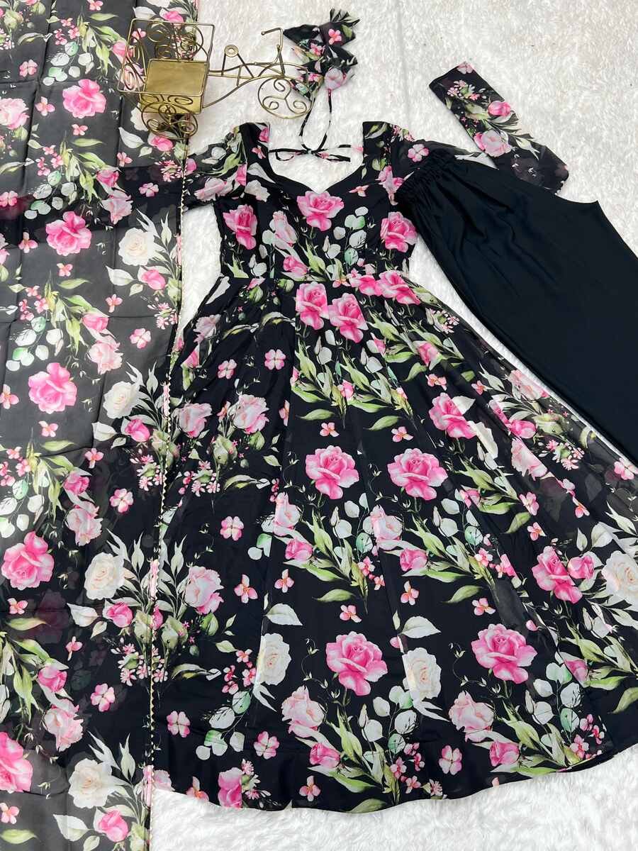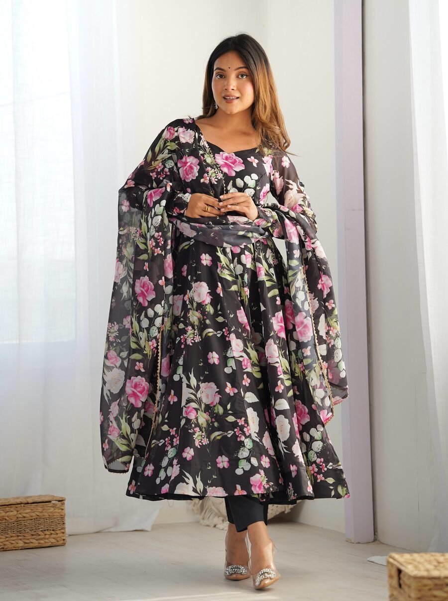 DESIGNER ORGANZA PRINTED EMBBROIDERY SEQUENCE WORK GOWN BOTTOM WIH DUPATTA BLACK
