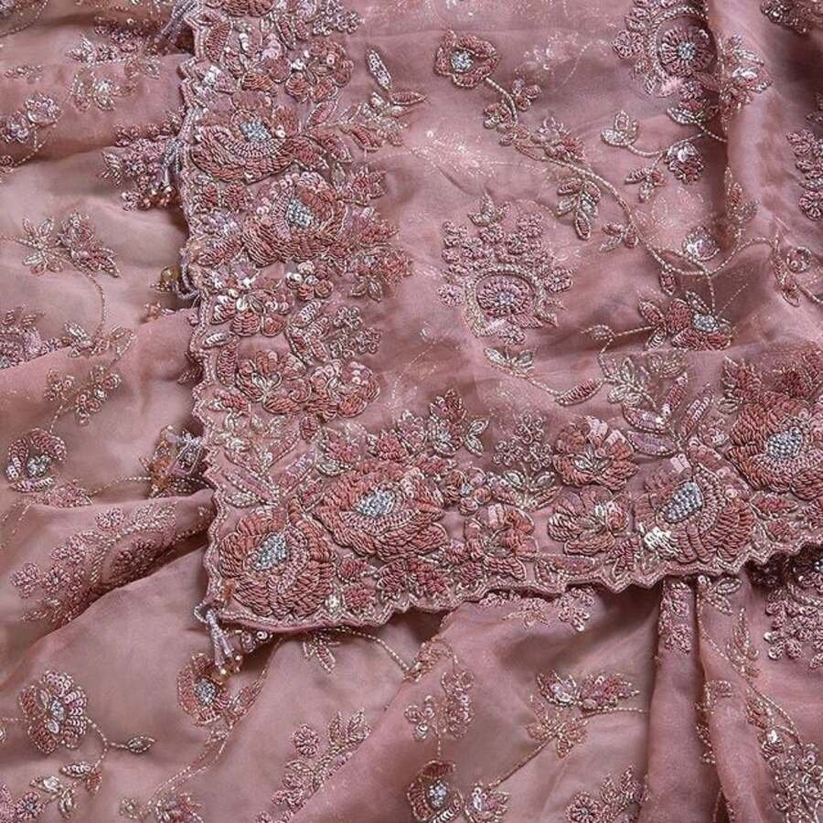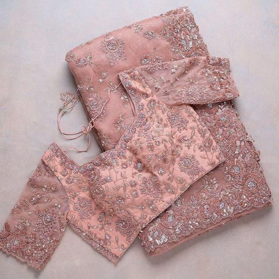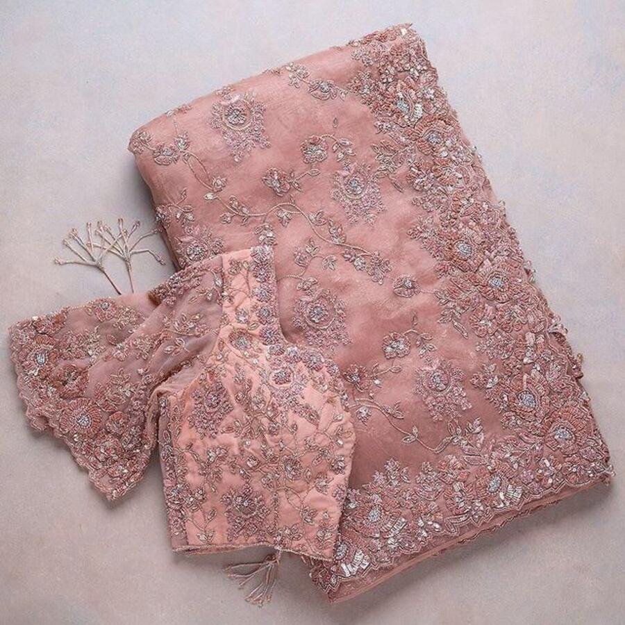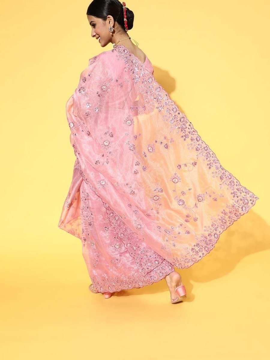 DESIGNER ORGANZA SILK EMBRODERY THREAD, ZARI WITH SEQUENCE WORK SAREE WITH UNSTITCHED BLOUSE BABY PINK