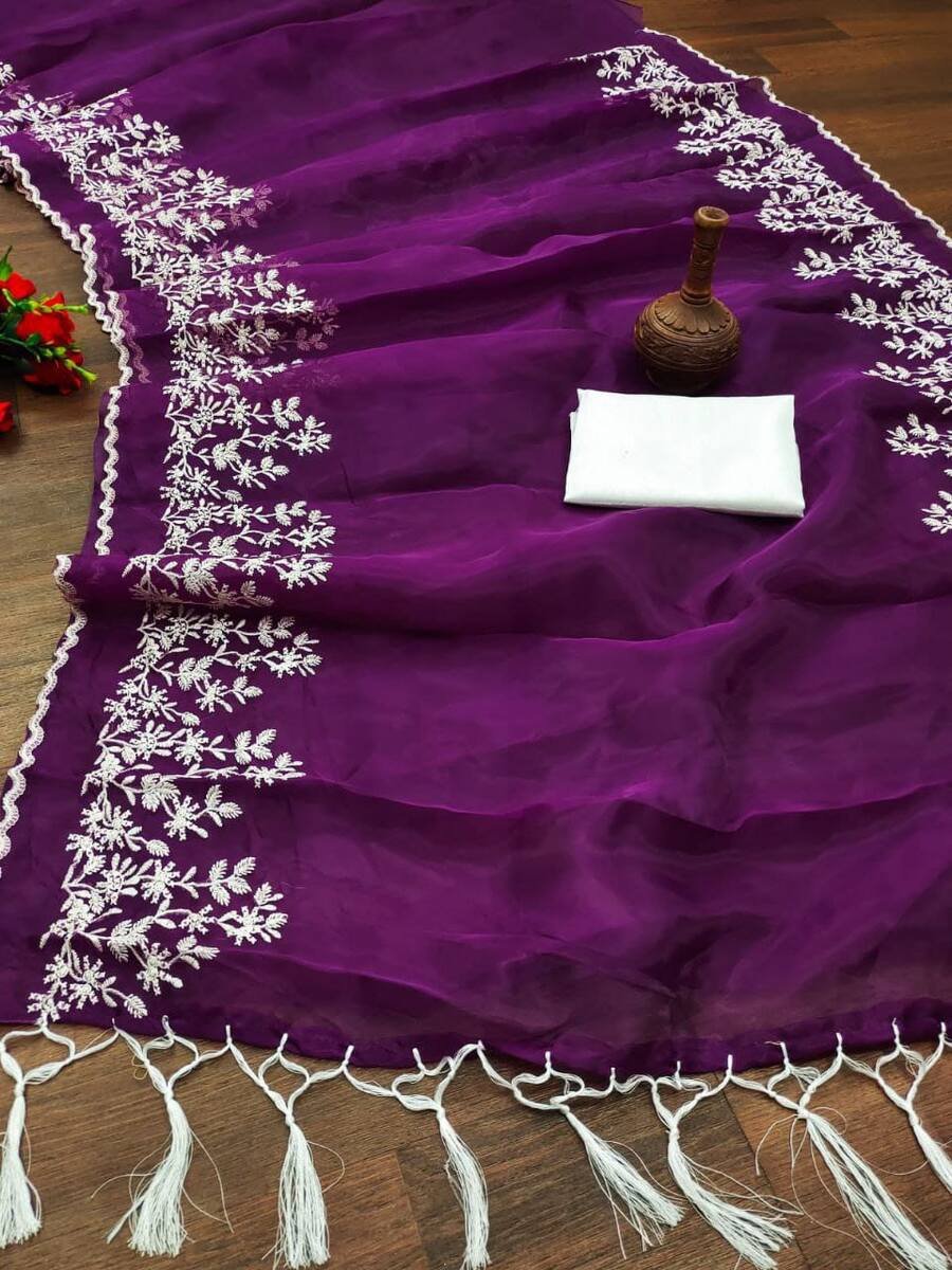 DESIGNER ORGENZA SILK EMBROIDERY AND ZALAR ON PALLU WORK SAREE WITH UNSTITCHED BLOUSE PURPLE