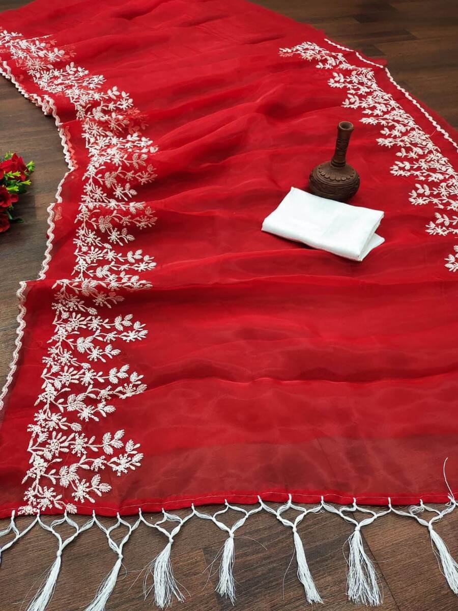 DESIGNER ORGENZA SILK EMBROIDERY AND ZALAR ON PALLU WORK SAREE WITH UNSTITCHED BLOUSE RED