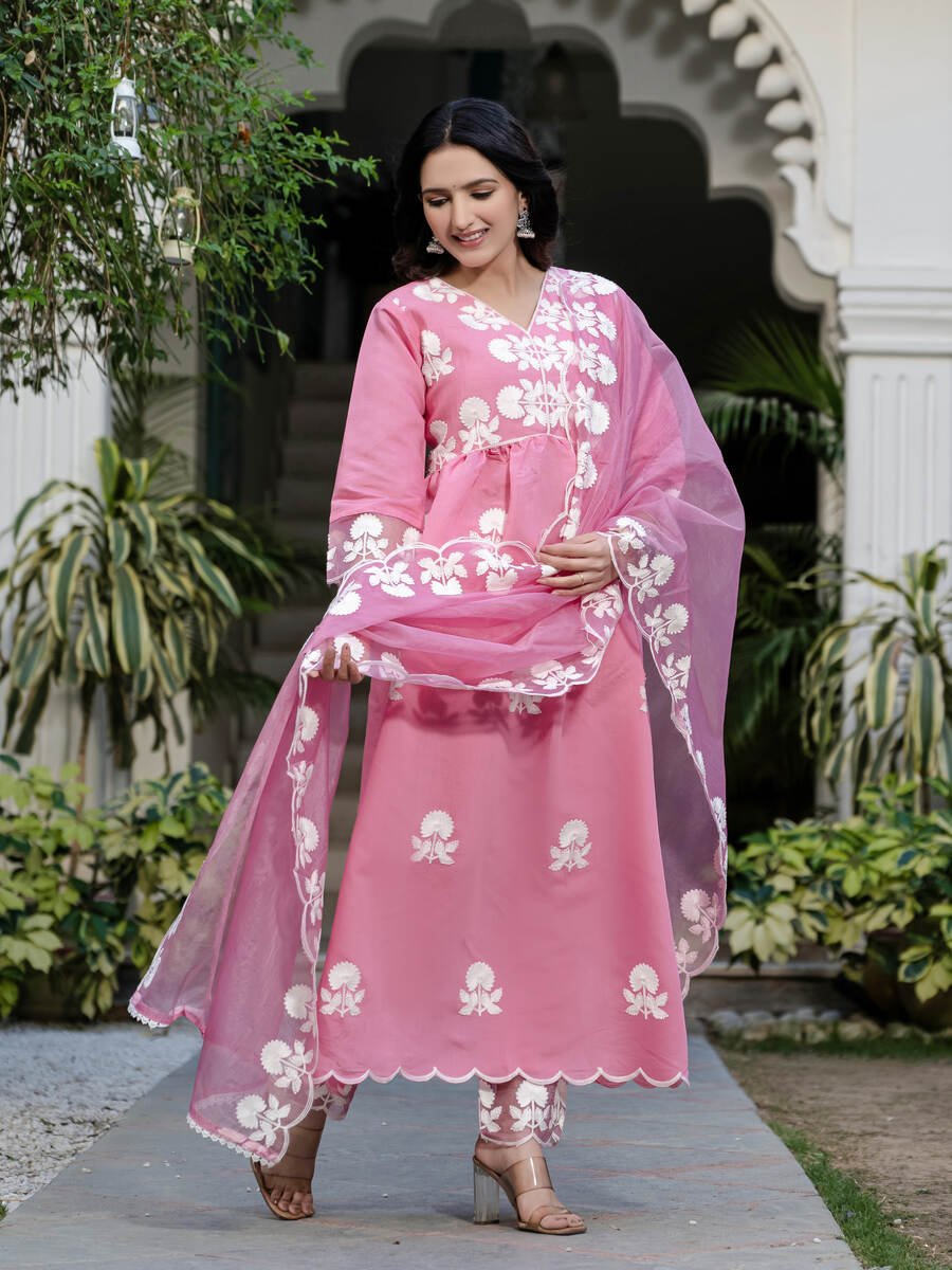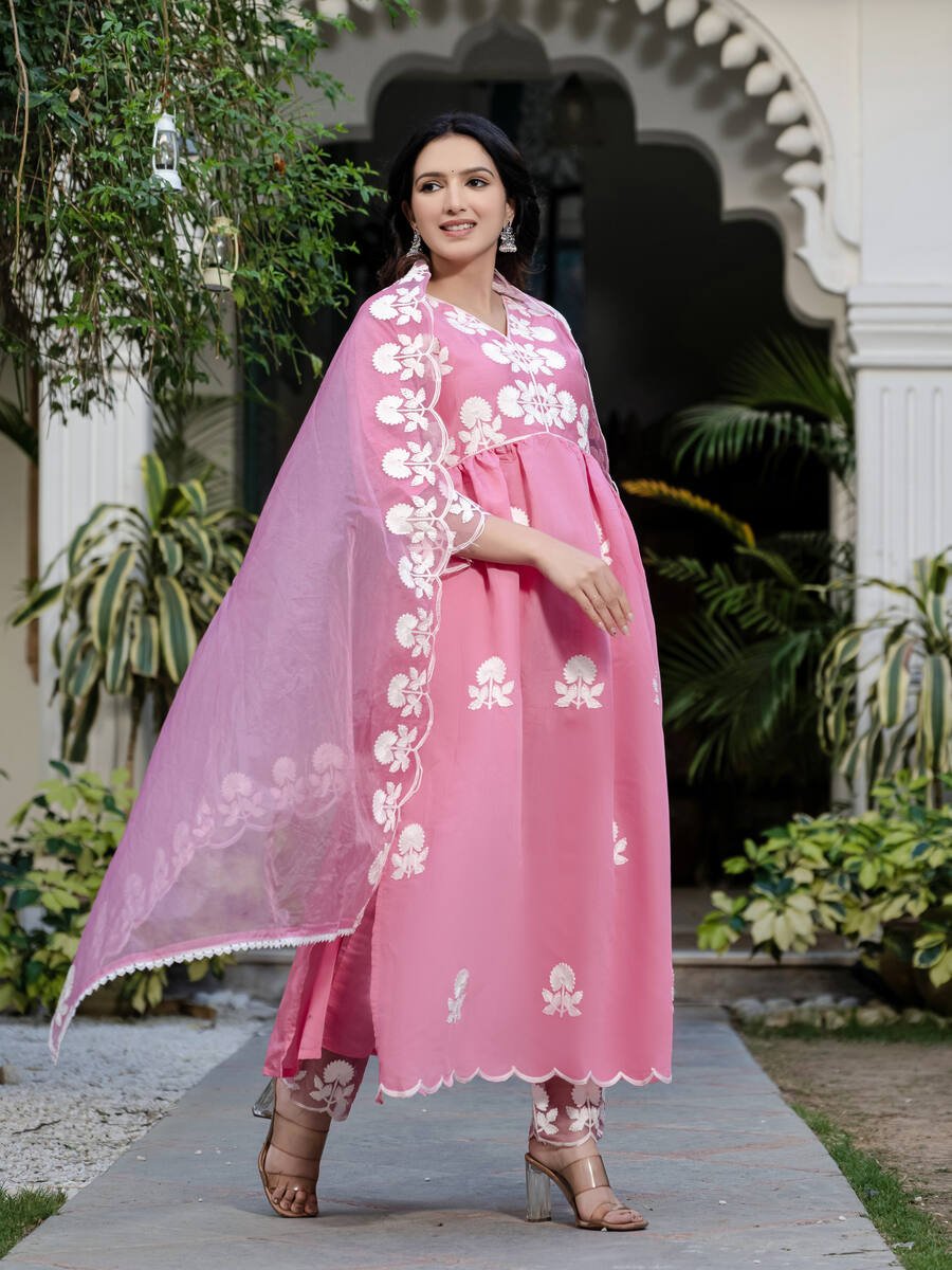 DESIGNER ROMAN SILK EMBROIDERY THREAD WORK TOP BOTTOM WITH DUPATTA PINK