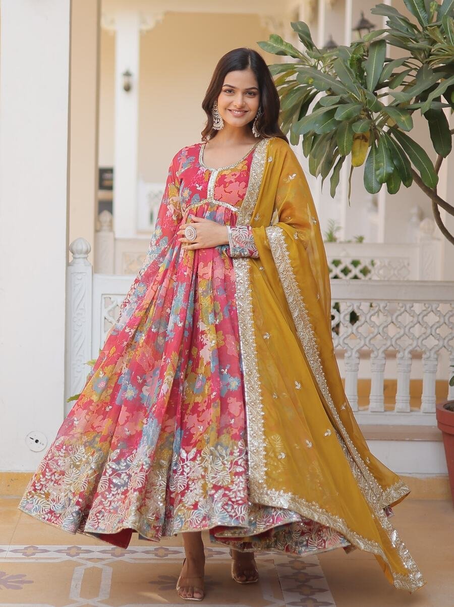 DESIGNER RUSSIAN SILK DIGITAL PRINTED EMBROIDERY SEQUENCE WORK GOWN WITH DUPATTA RED