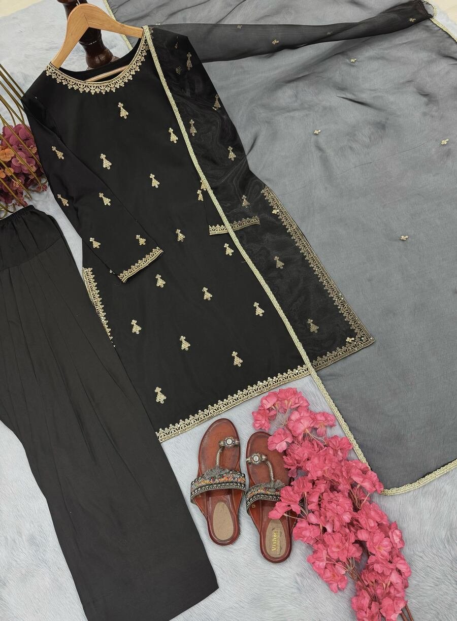 DESIGNER SATIN EMBROIDERY LACE WORK TOP PATIYALA WITH DUPATTA BLACK