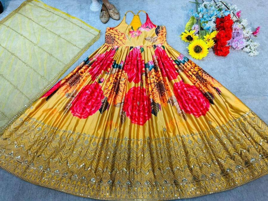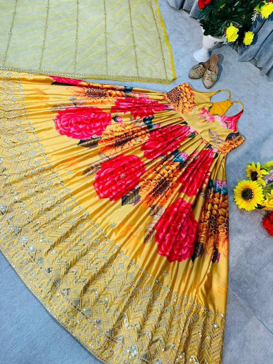 DESIGNER SATIN SILK EMBROIDERY SEQUENCE WORK GOWN WITH DUPATTA YELLOW