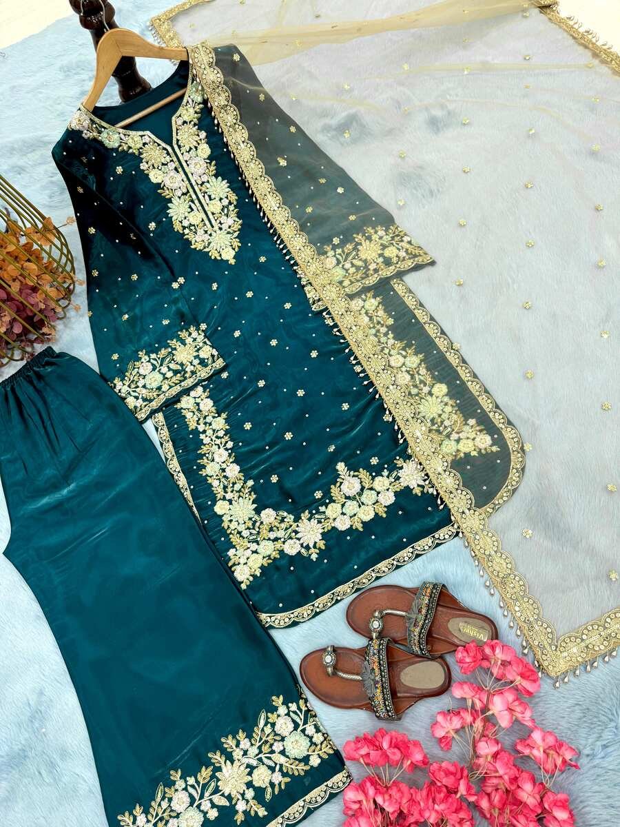 DESIGNER SEQUENCE AND ZARI EMBROIDERY WITH PEARL AND DIAMOND HANDWORK TOP PALAZZO WITH DUPATTA GREEN