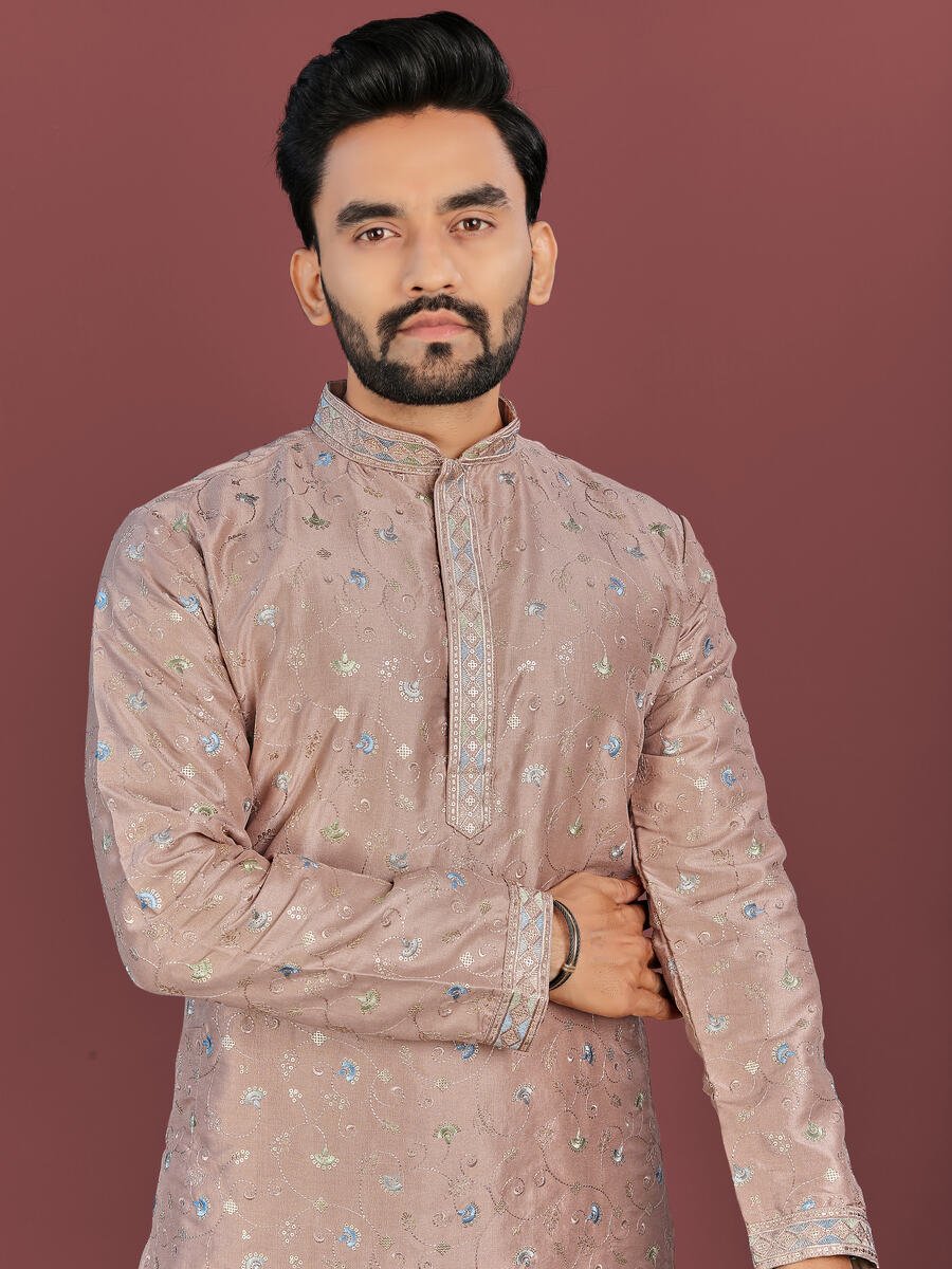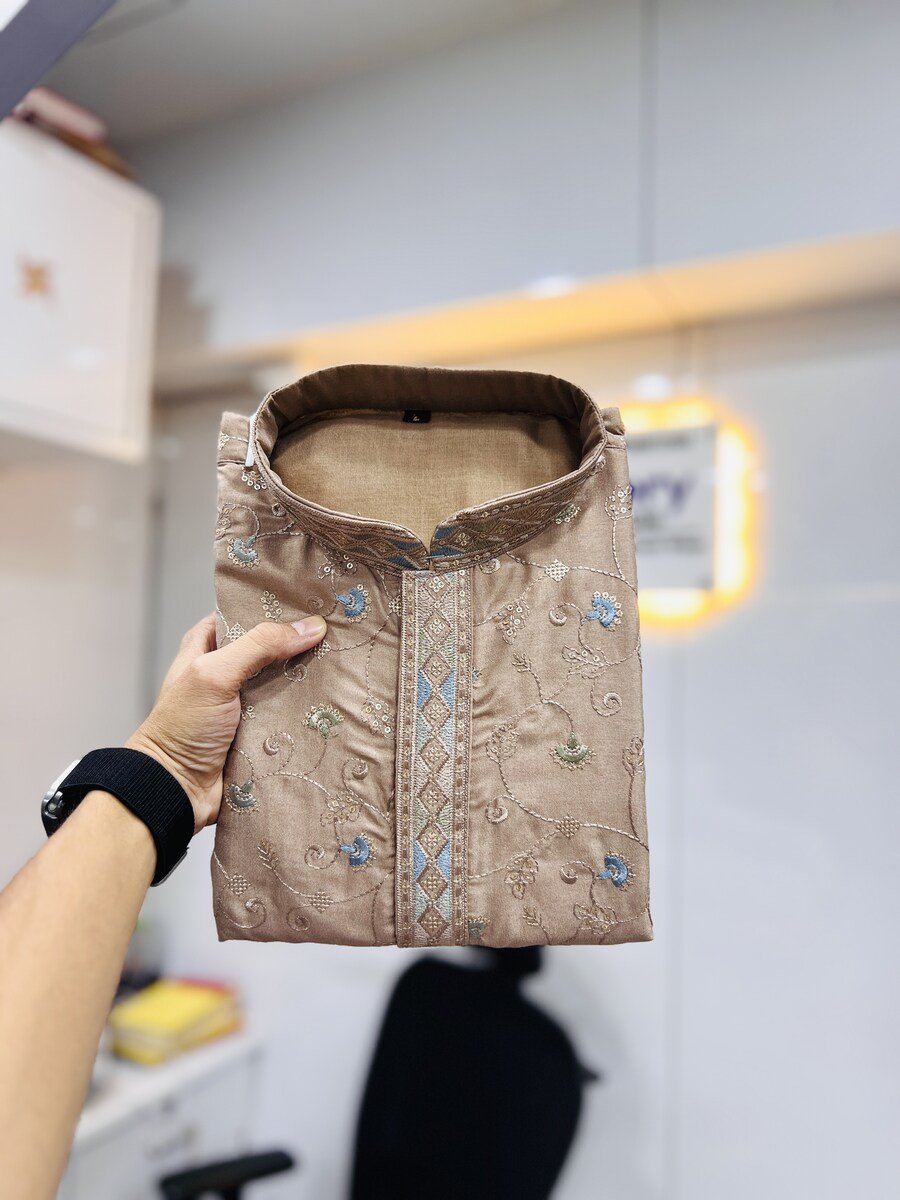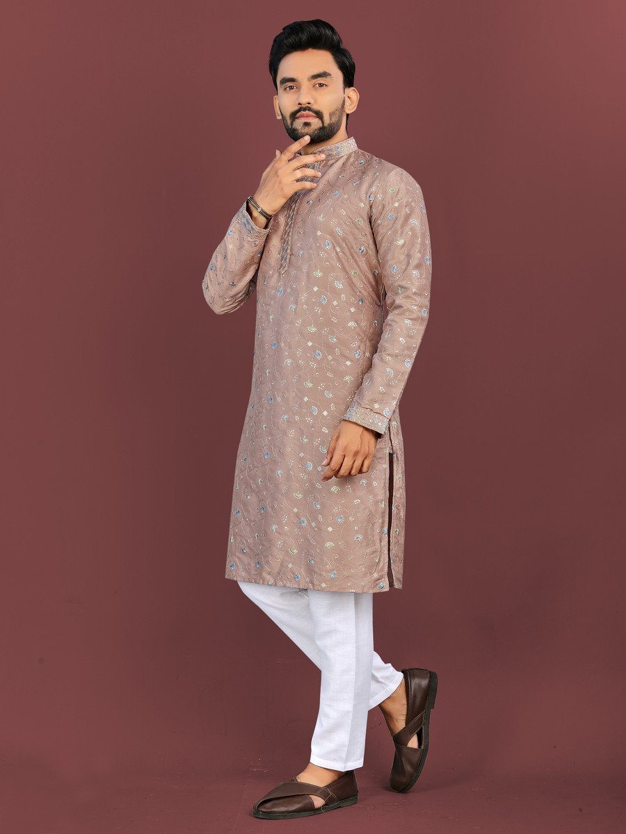 DESIGNER SILK MULTI COLOUR EMBROIDERY FLOWER WORK WITH ALL OVER MATTE SEQUENCE KURTA PAYJAMA KHAKHI