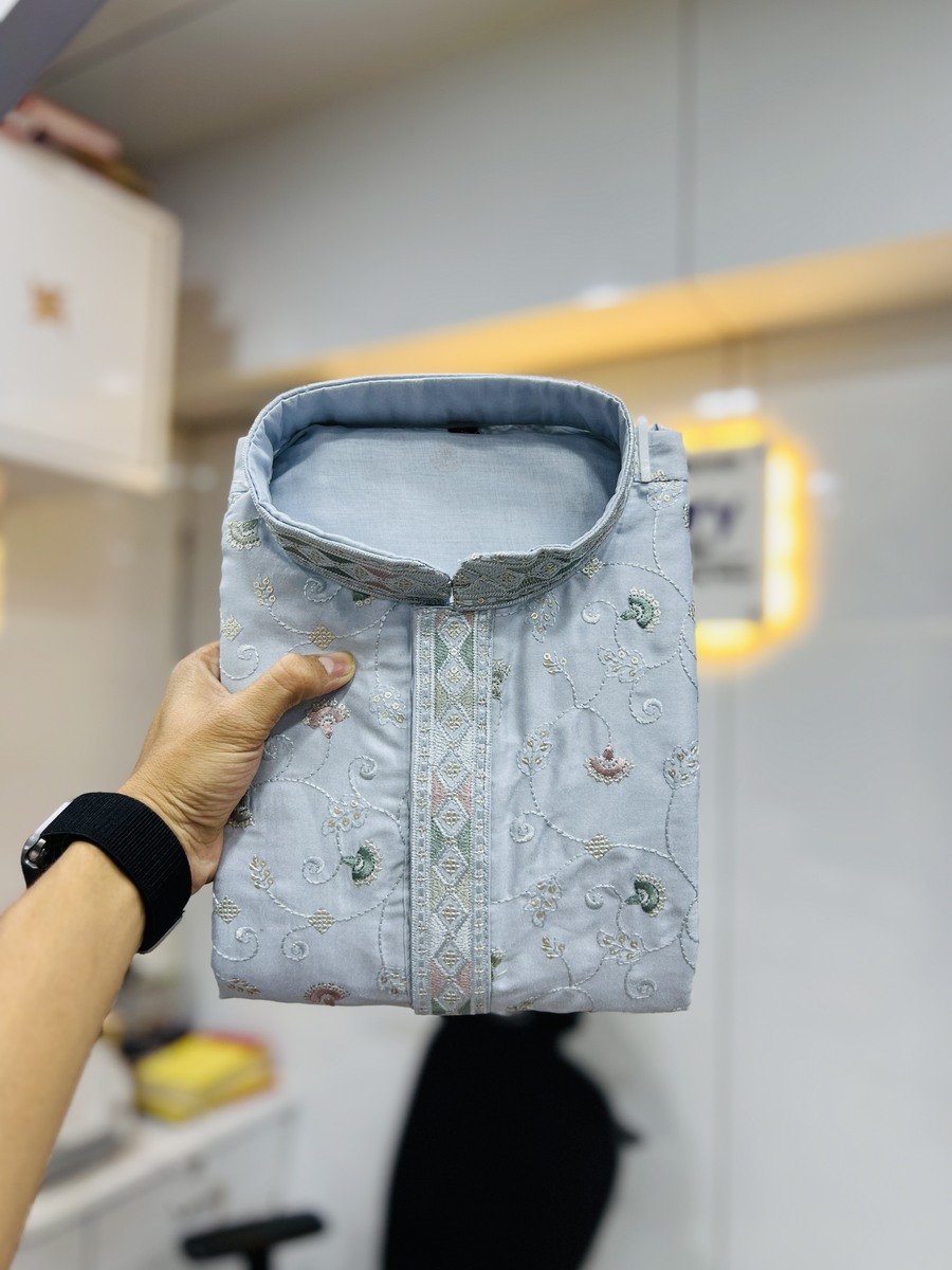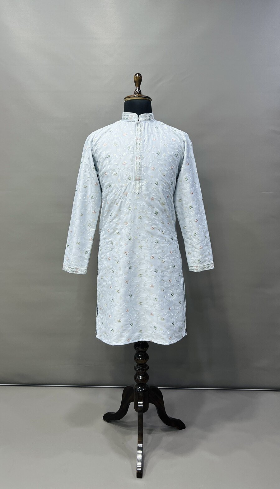 DESIGNER SILK MULTI COLOUR EMBROIDERY FLOWER WORK WITH ALL OVER MATTE SEQUENCE KURTA PAYJAMA SKY