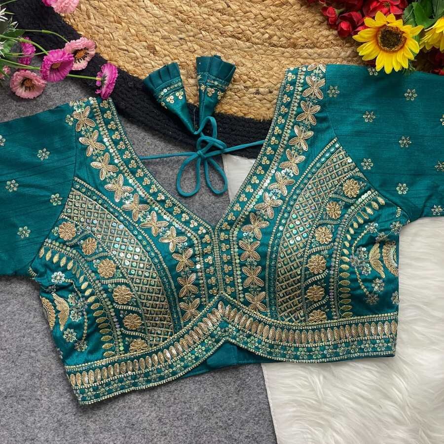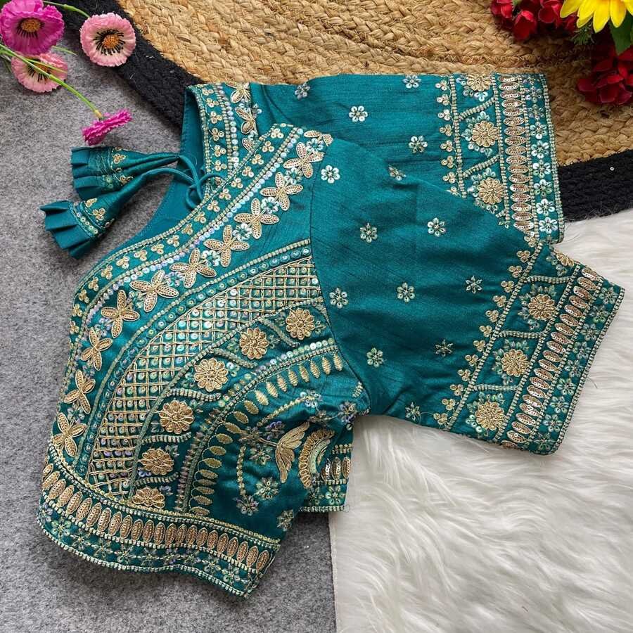 DESIGNER SOFT ITALIAN SILK CODING EMBROIDERY THREAD & SEQUENCE WORK STITCHED BLOUSE SKY