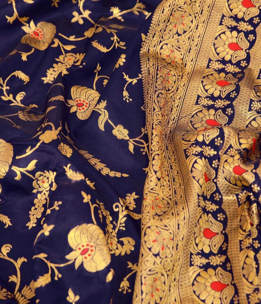 DESIGNER SOFT LICHI SILK JACQUARD WORK WITH ORIGINAL GOLD ZARI SAREE WITH UNSTITCHED BLOUSE NEVY BLUE