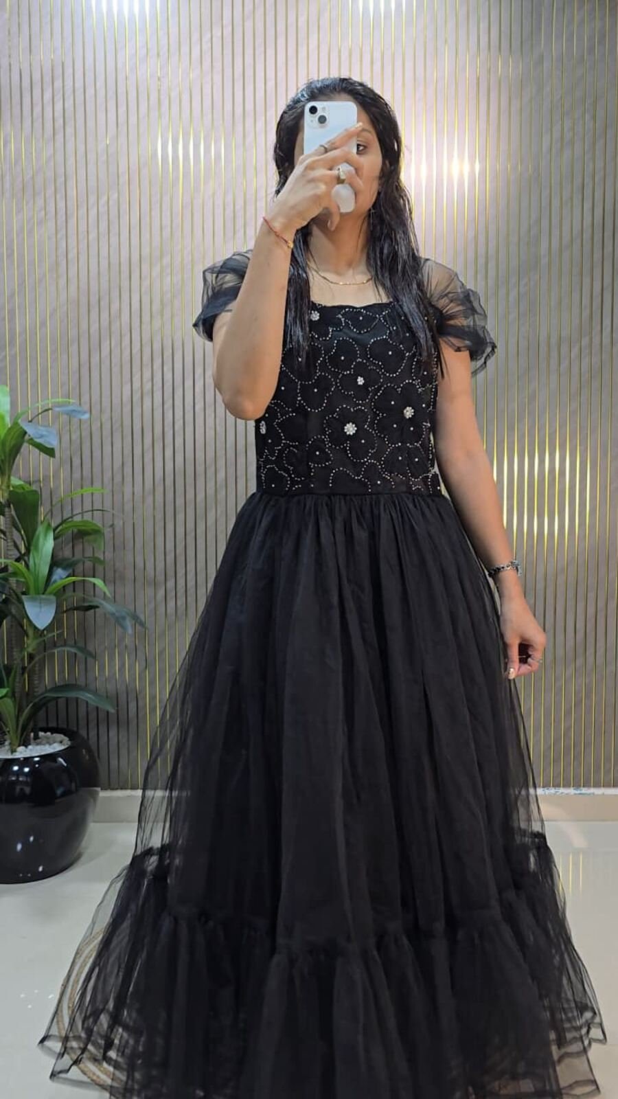 DESIGNER SOFT NET FABRIC WITH DESIGNER NET WORK MIDI DRESS BLACK