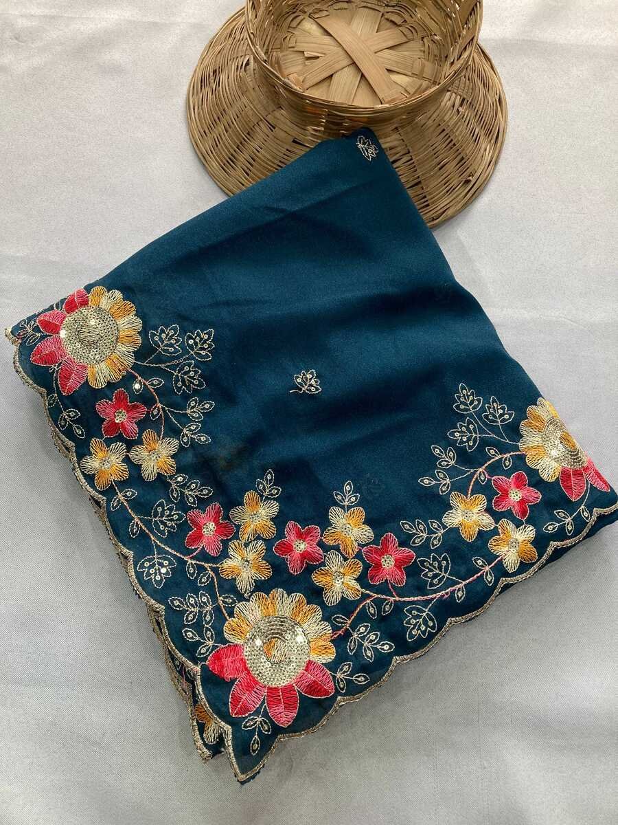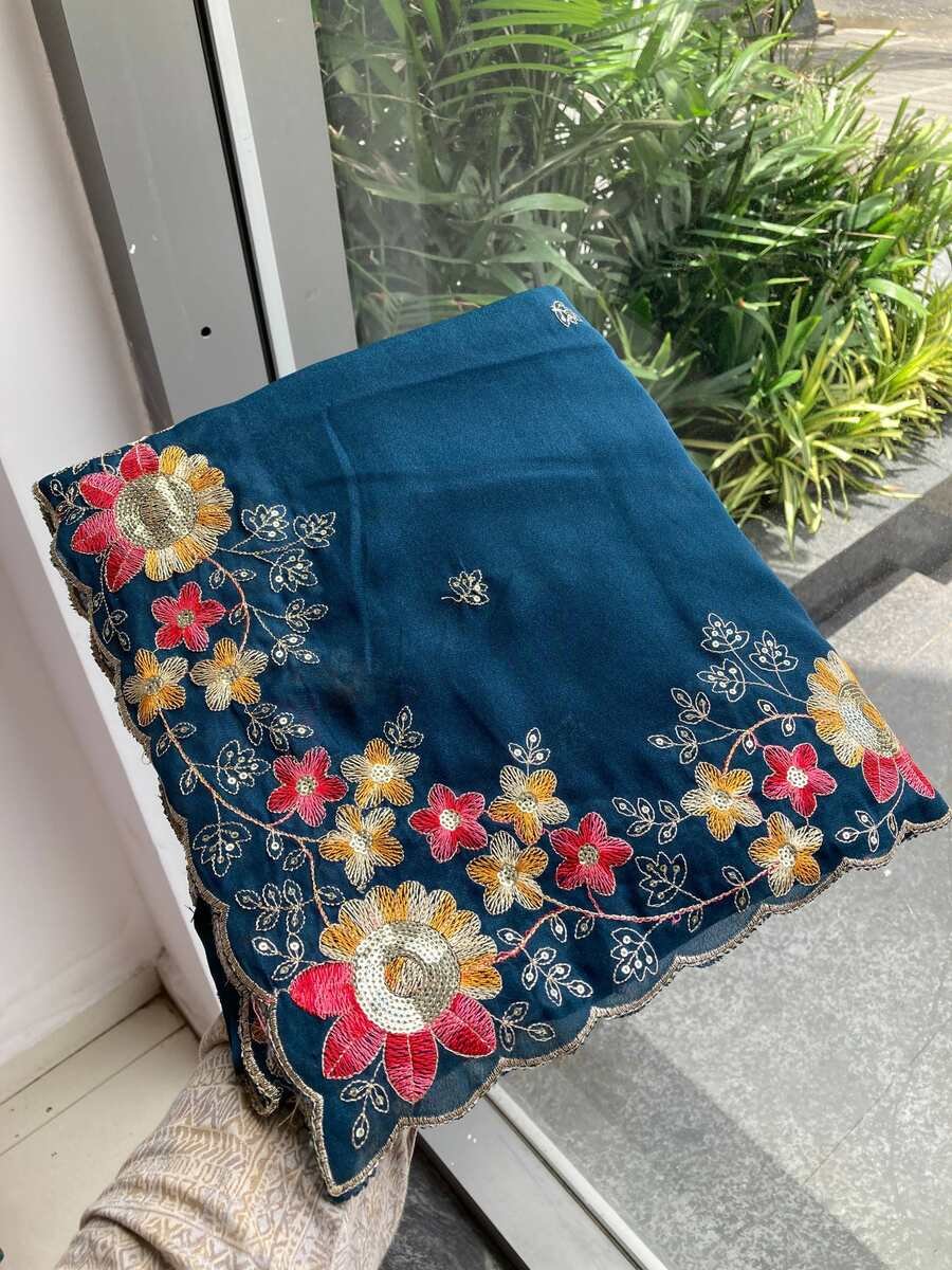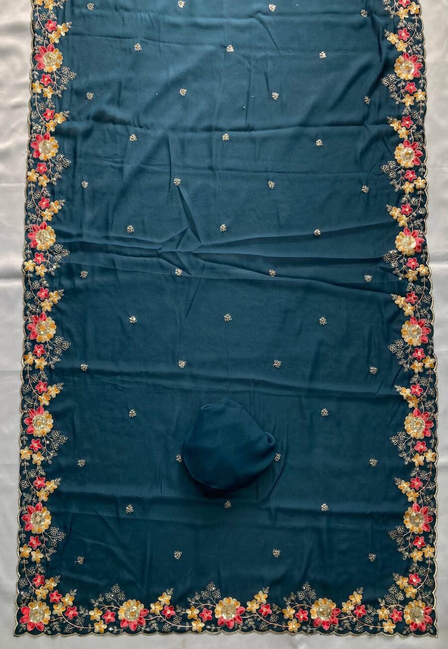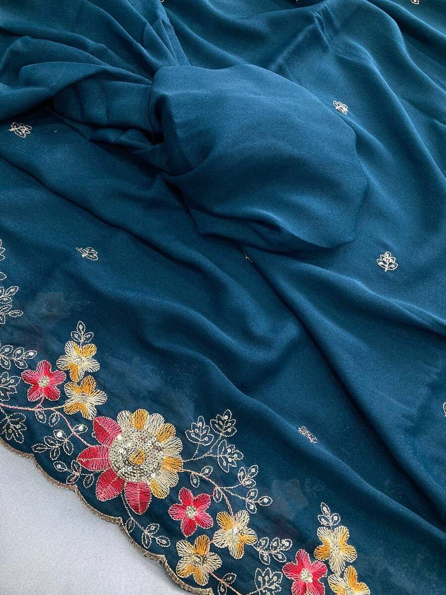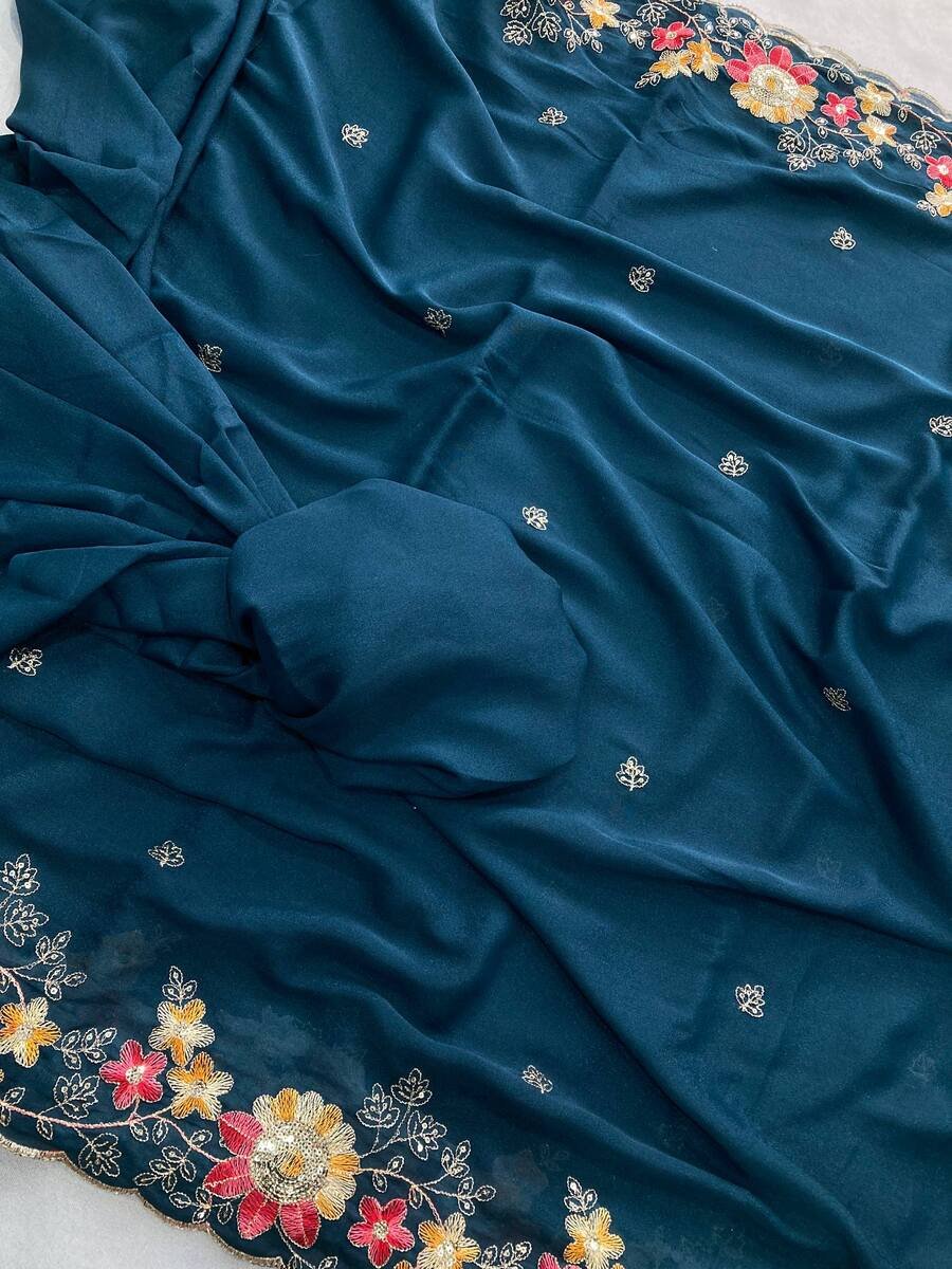 DESIGNER STAR GEORGETTE EMBROIDERY CUTWORK WORK LACE BORDER WORK SAREE WITH UNSTITCHED BLOUSE NAVY BLUE
