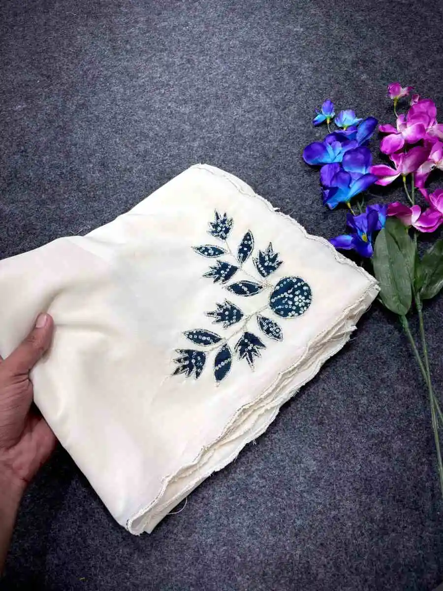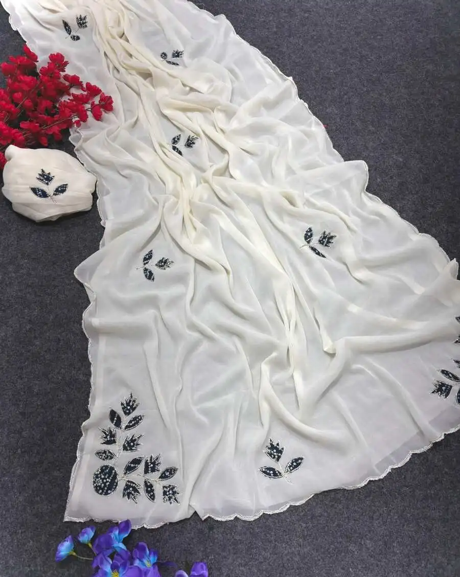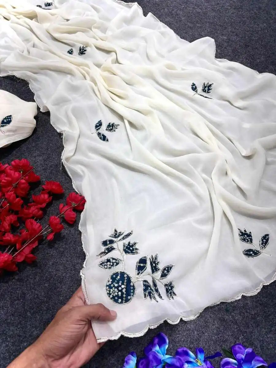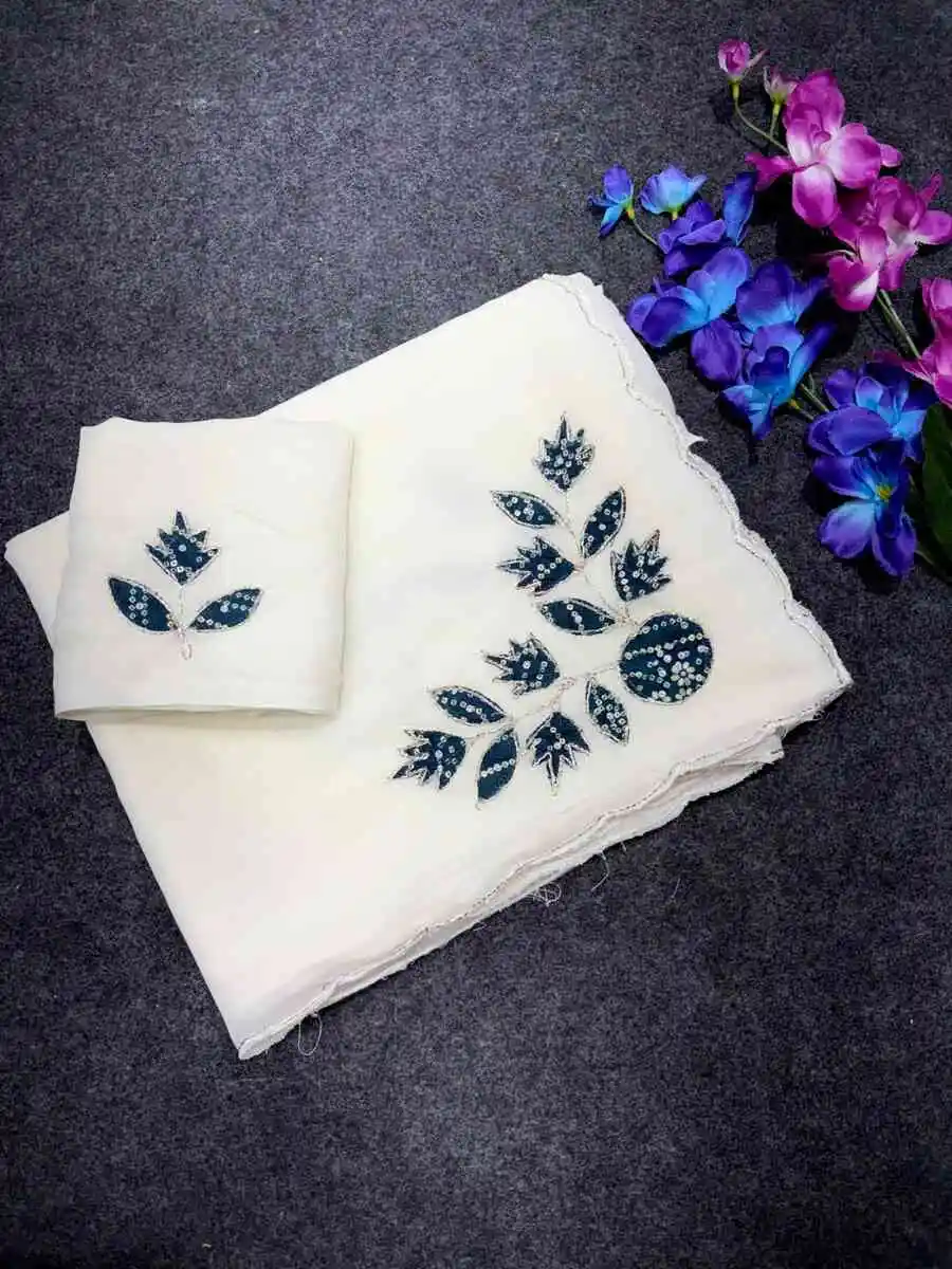 DESIGNER STAR GEORGETTE MULTI COLOR PATCH WORK AND HANDWORK BORDER WORK SAREE WITH UNSTITCHED BLOUSE WHITE AND BLUE