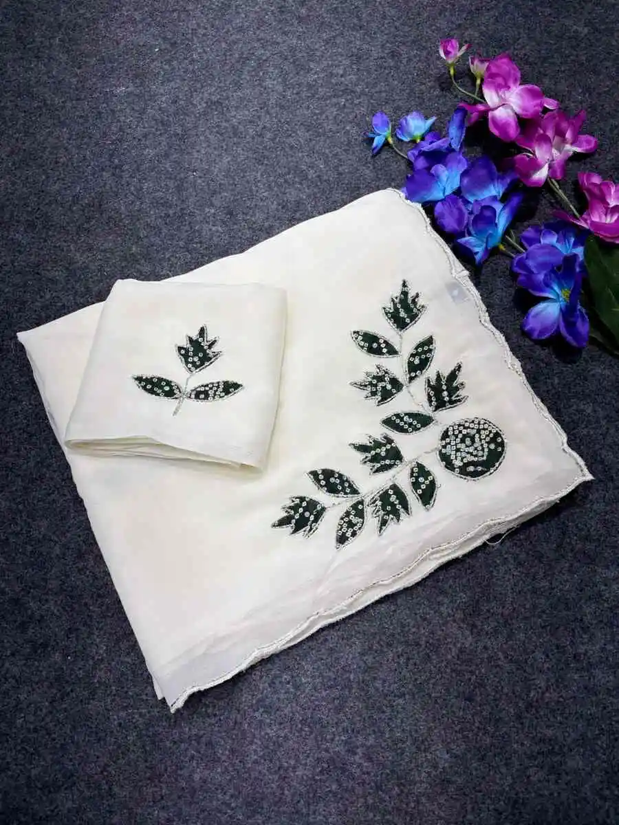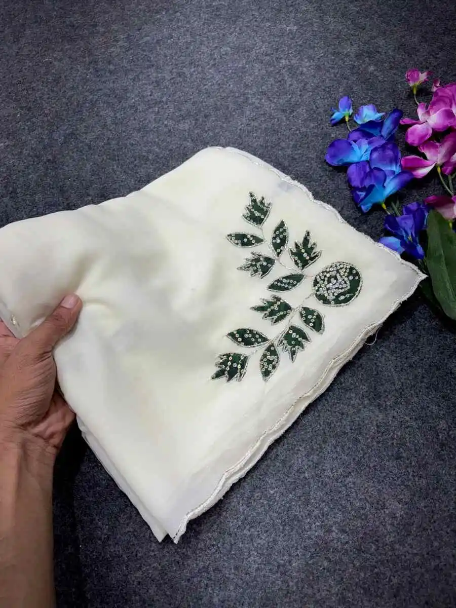 DESIGNER STAR GEORGETTE MULTI COLOR PATCH WORK AND HANDWORK BORDER WORK SAREE WITH UNSTITCHED BLOUSE WHITE AND GREEN