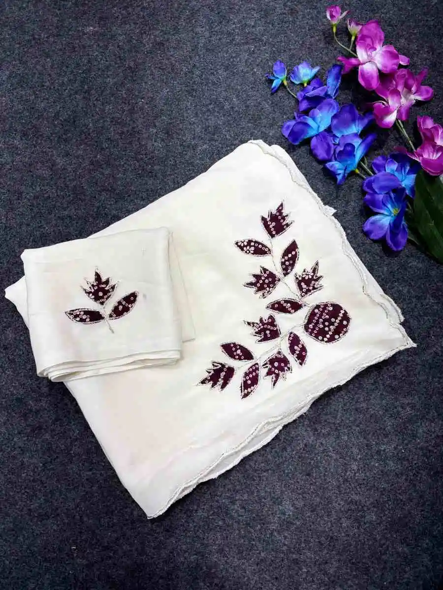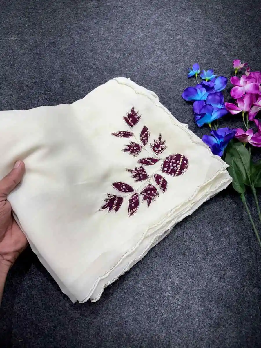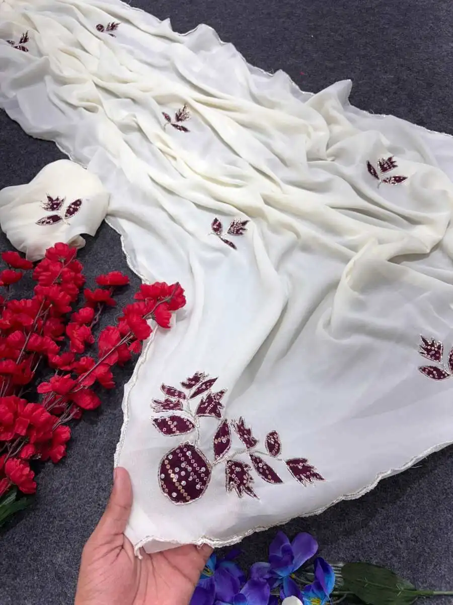 DESIGNER STAR GEORGETTE MULTI COLOR PATCH WORK AND HANDWORK BORDER WORK SAREE WITH UNSTITCHED BLOUSE WHITE AND WINE