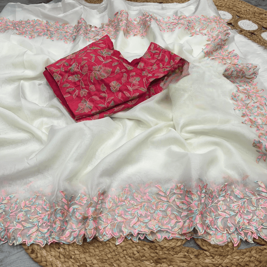 DESIGNER TABBY ORGENZA MULTI THREAD EMBROIDERY WORK SAREE WITH UNSTITCHED BLOUSE WHITE