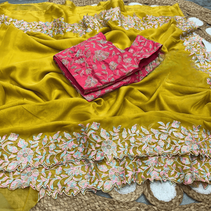 DESIGNER TABBY ORGENZA MULTI THREAD EMBROIDERY WORK SAREE WITH UNSTITCHED BLOUSE YELLOW