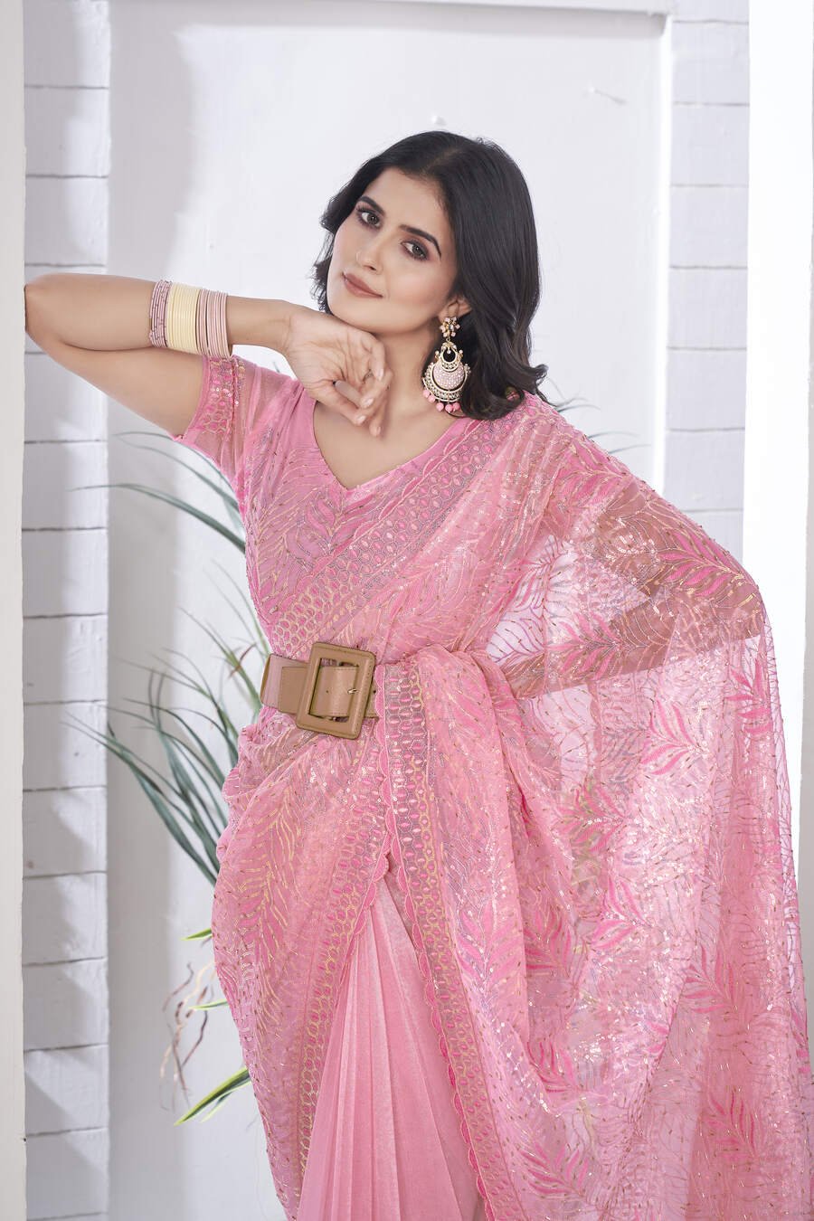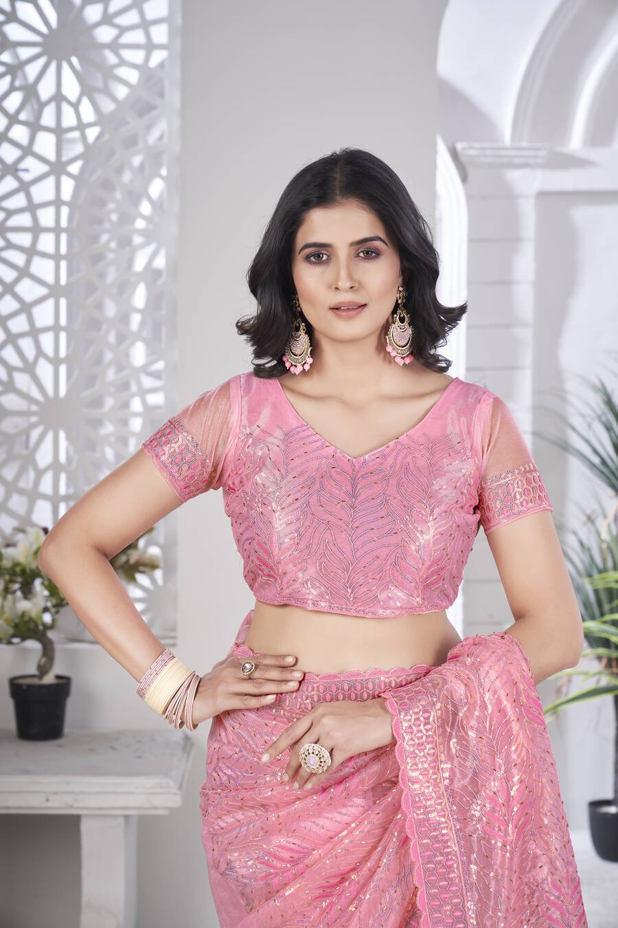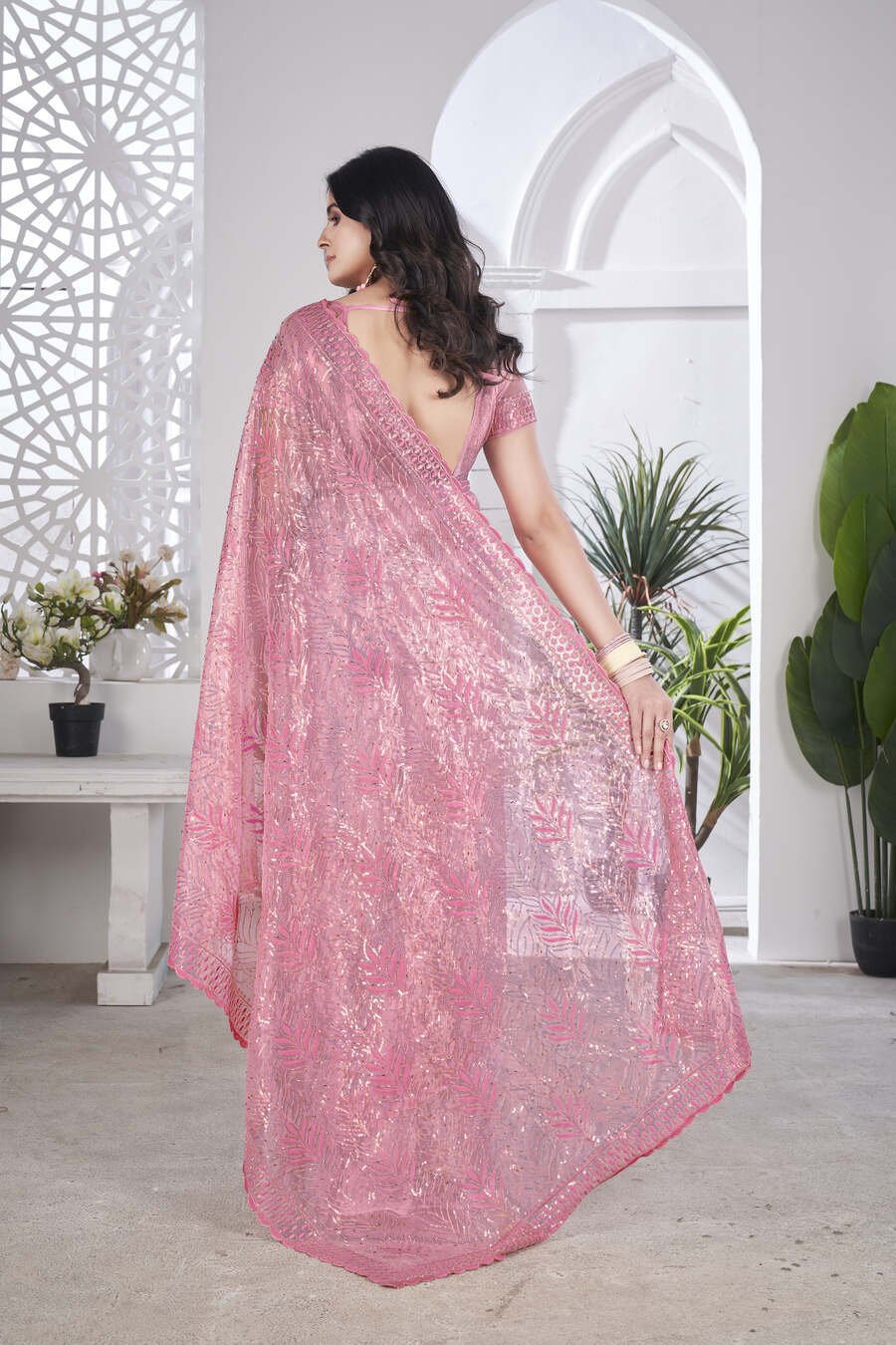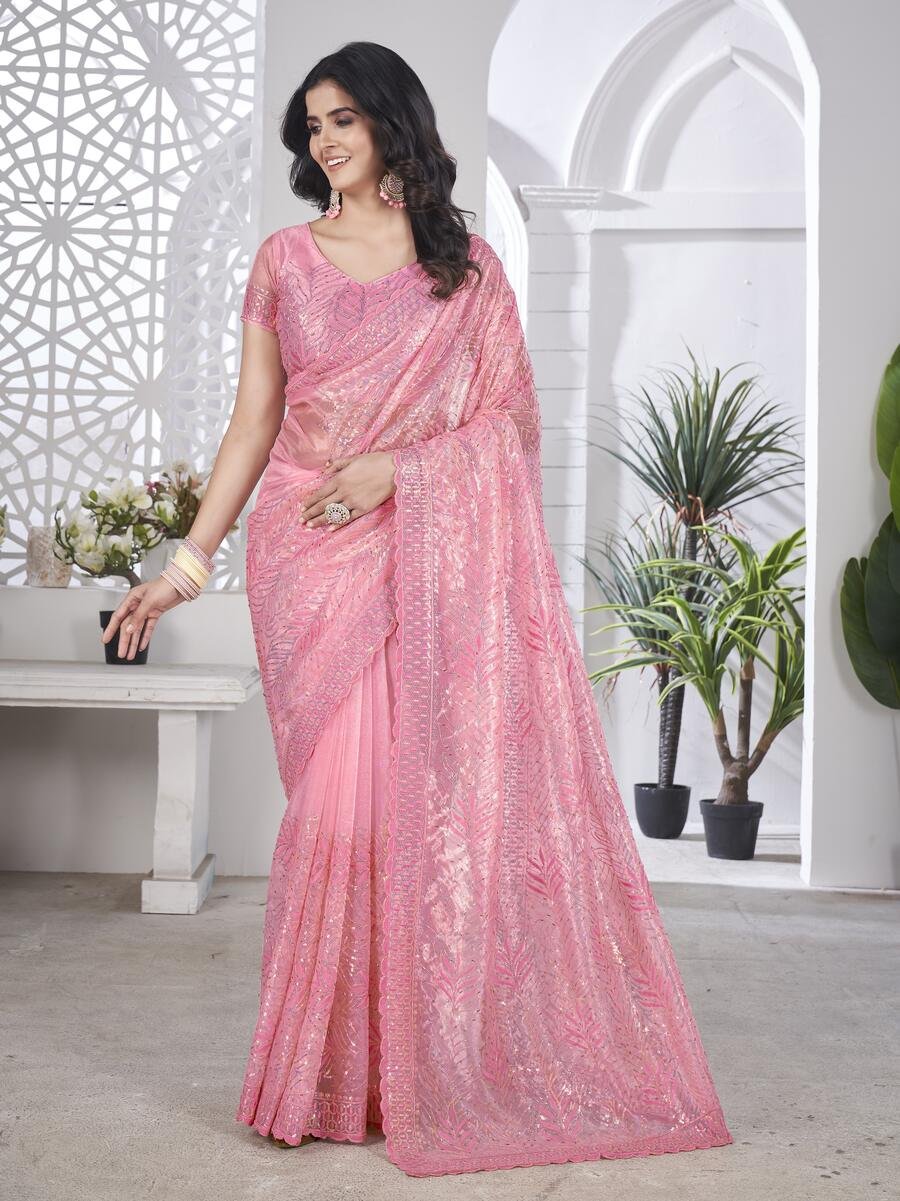 DESIGNER TISSUE NET SEQUENCE & PITA WORK WITH MULTI COLOUR THREAD EMBROIDERY WORK SAREE WITH UNSTITCHED BLOUSE PINK