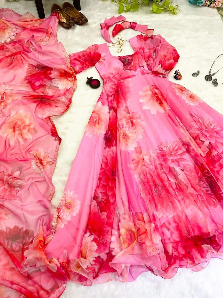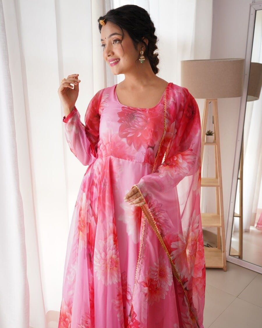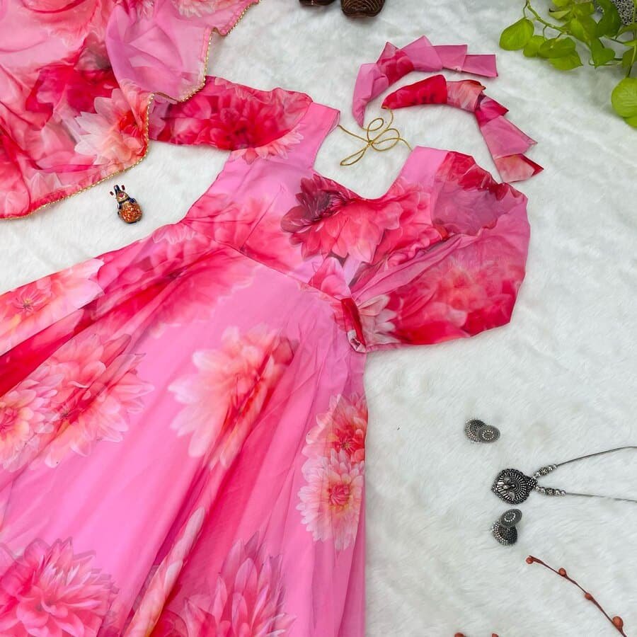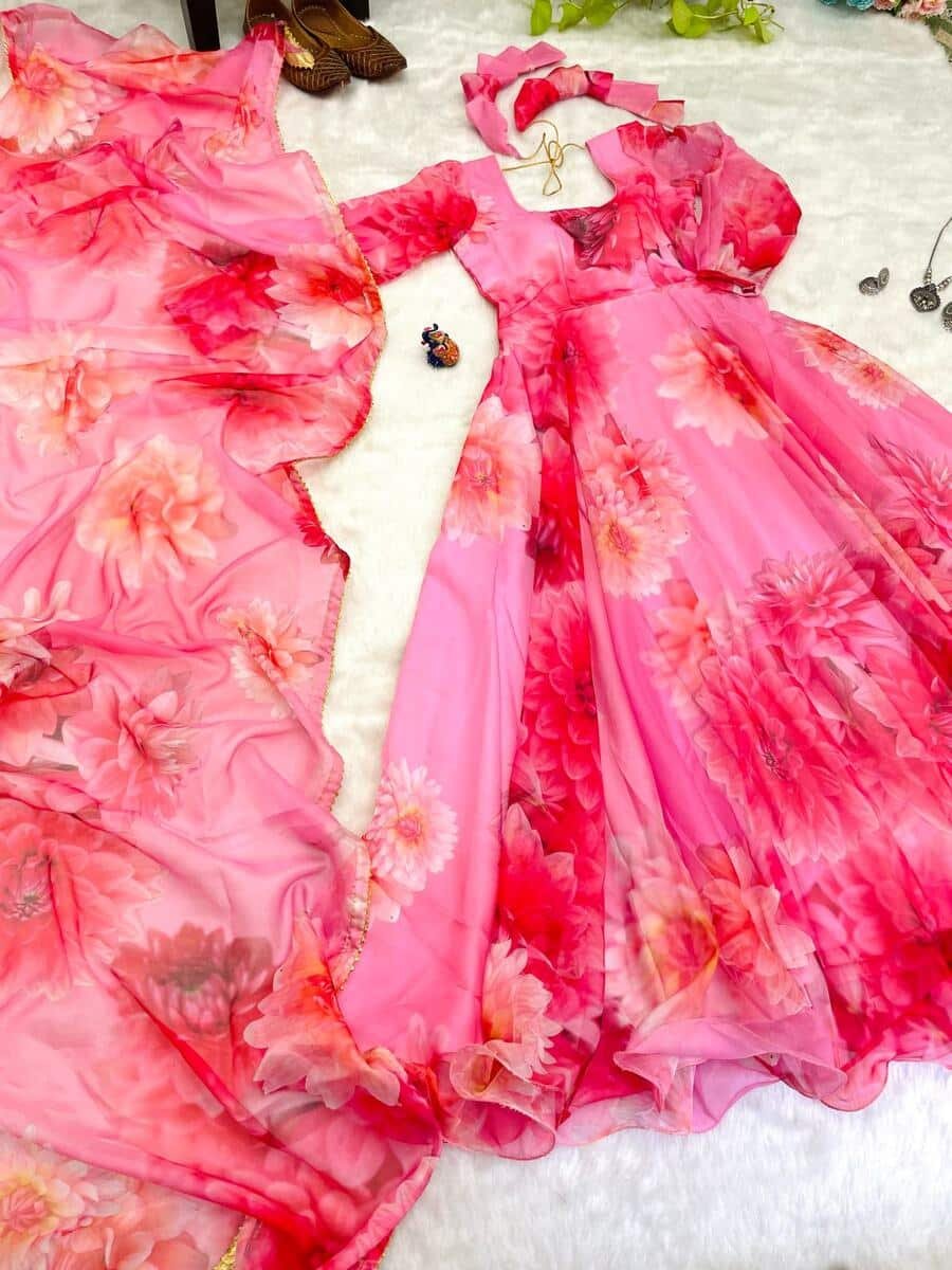 DESIGNER TUBBY ORGANZA DIGITAL PRINT WORK GOWN WITH DUPATTA PINK