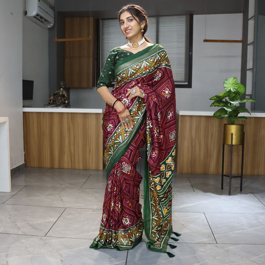 DESIGNER TUSSAR SILK PRINT WITH FOIL WORK SAREE WITH UNSTITCHED BLOUSE WINE