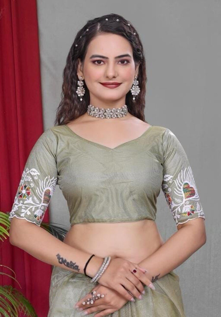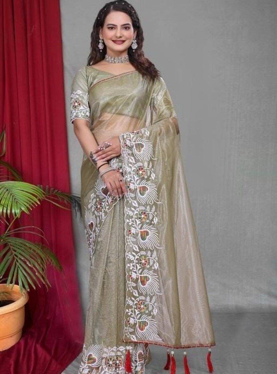 DESIGNER TWILL NET MULTI WORK SAREE WITH UNSTITCHED BLOUSE GREY