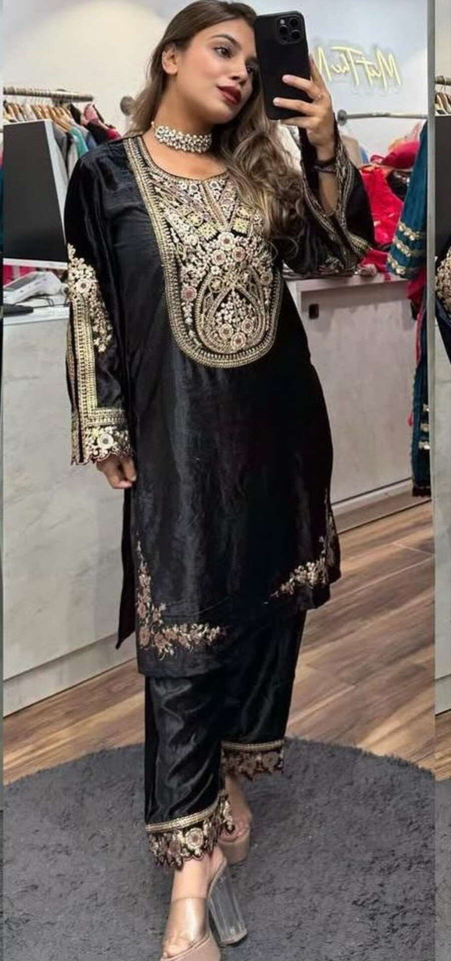 DESIGNER VELVET EMBROIDERY CODING SEQUENCE WORK KURTI WITH PALAZZO BLACK