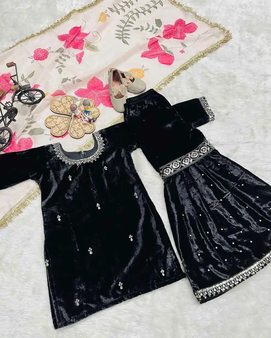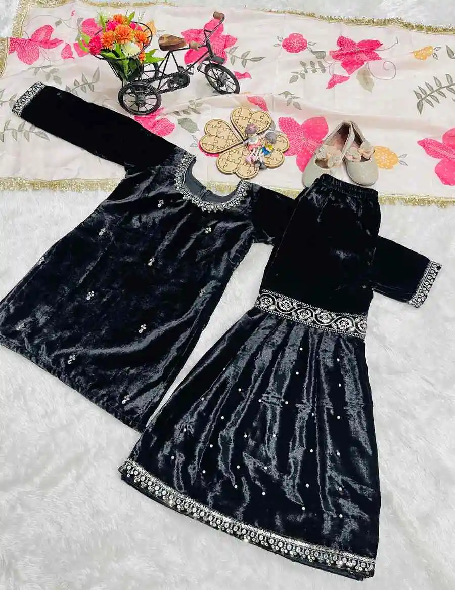 DESIGNER VELVET EMBROIDERY SEQUENCE WORK TOP SHARARA WITH DUPATTA BLACK