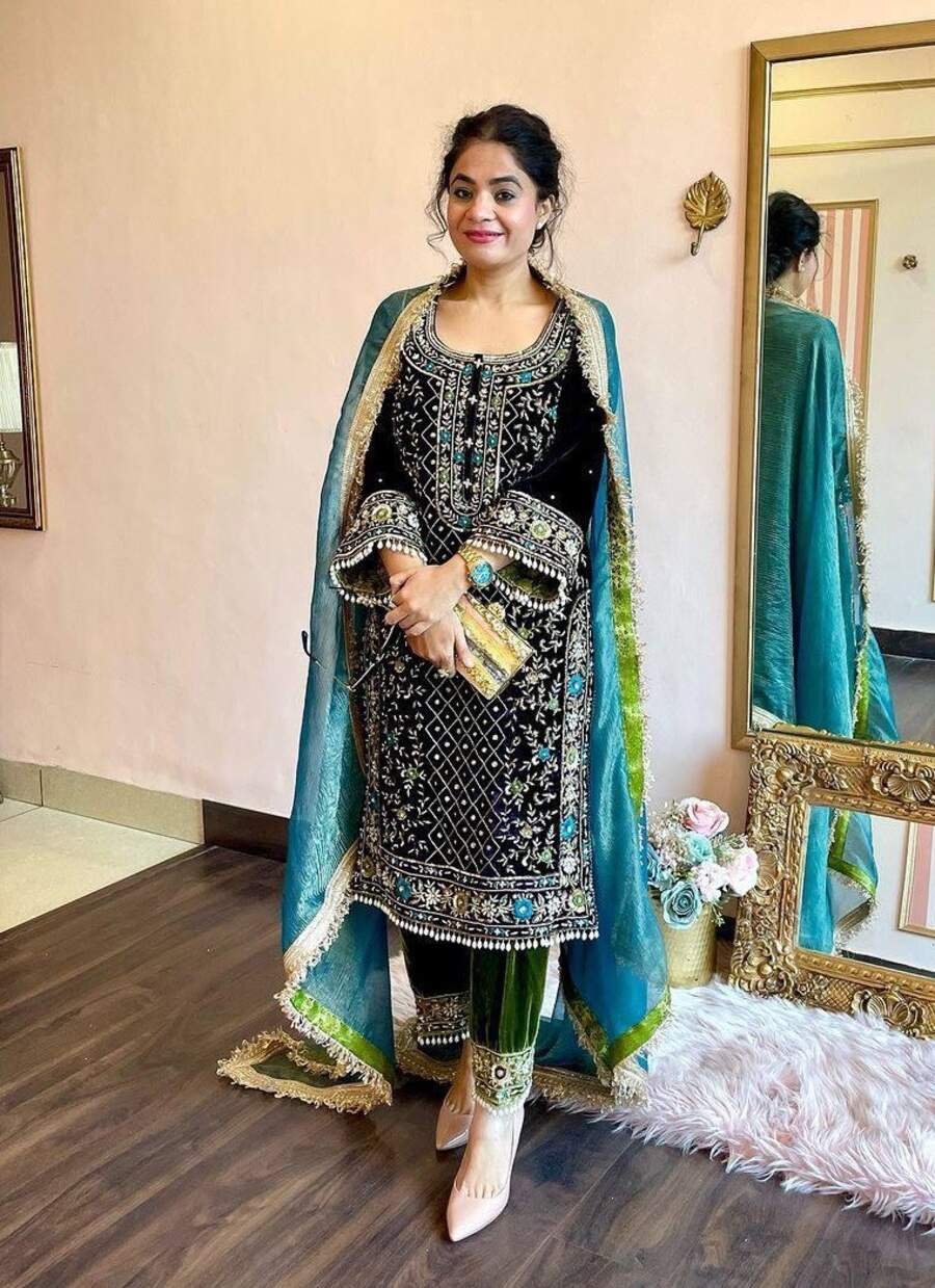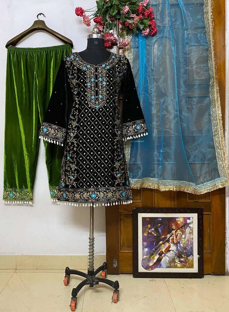 DESIGNER VELVET EMBROIDERY WORK & HAND WORK TOP BOTTOM DUPATTA BLACK
