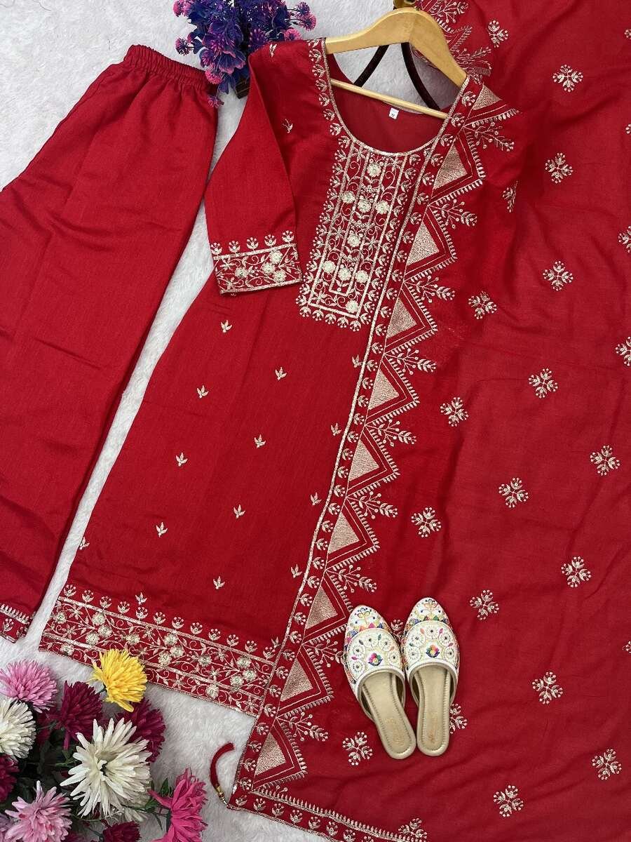DESIGNER VICHITRA SILK EMBROIDERY SEQUENCE WORK TOP BOTTOM WITH DUPATTA RED