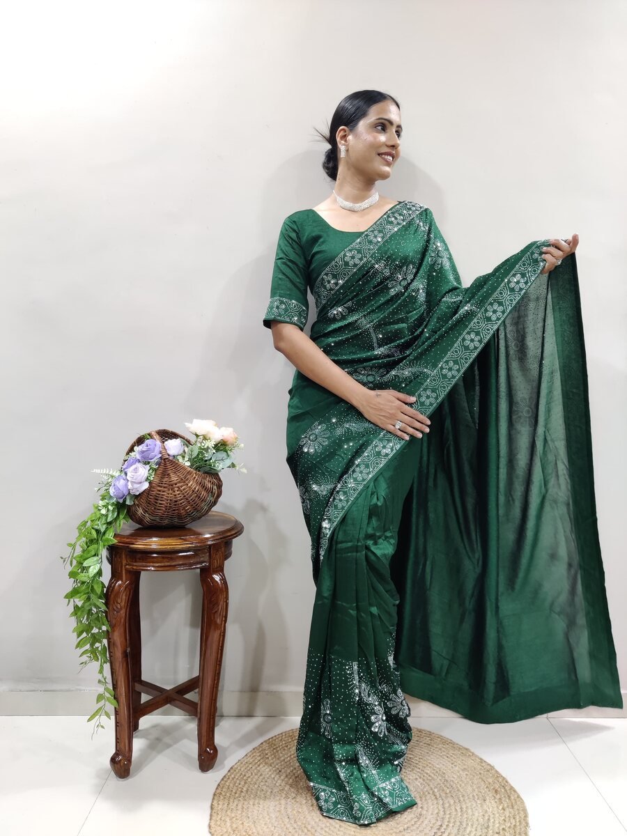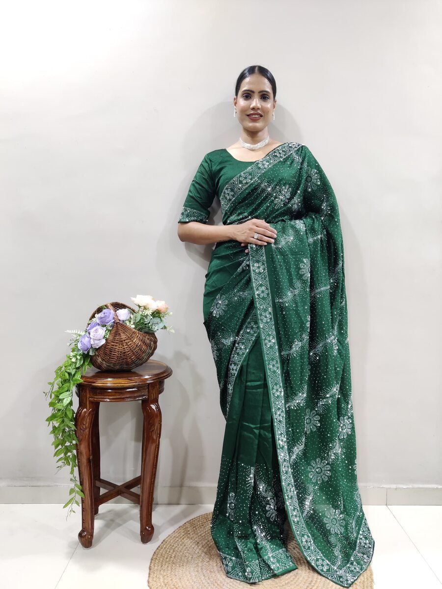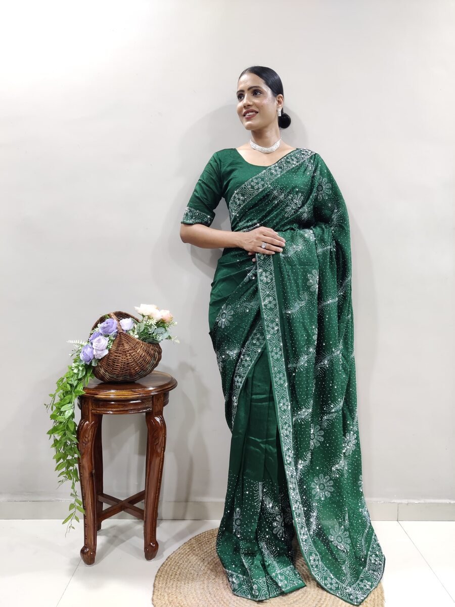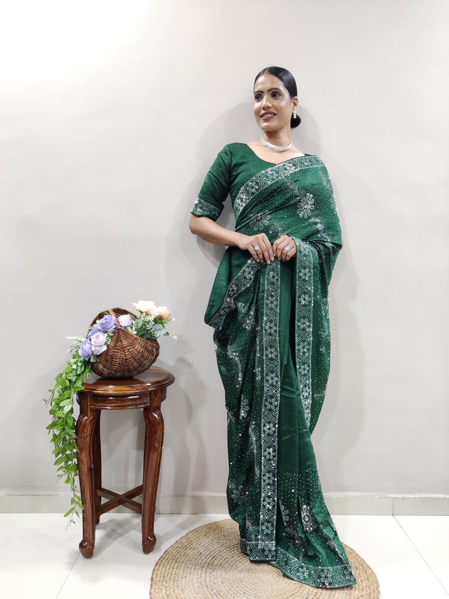 DESIGNER VICHITRA SILK STONE WORK READY TO WEAR SAREE WITH UNSTITCHED BLOUSE GREEN