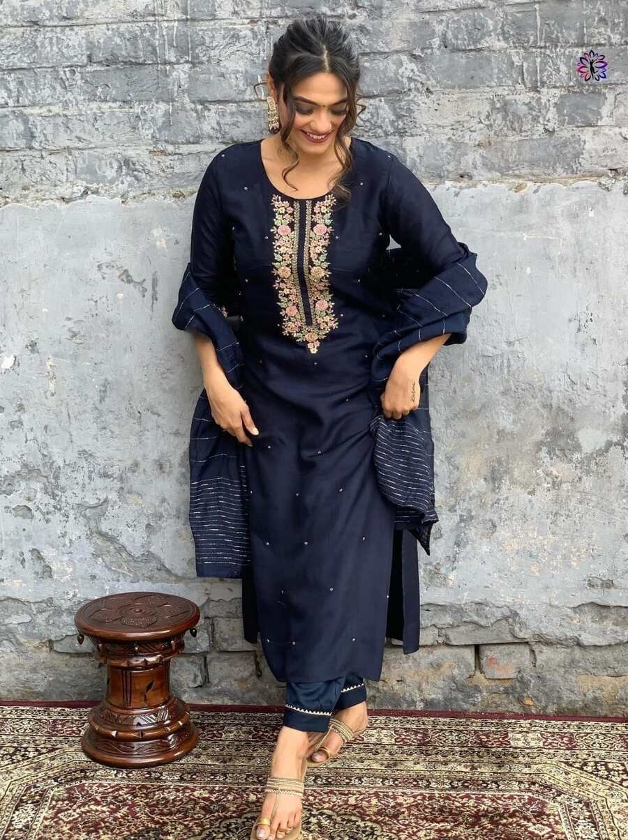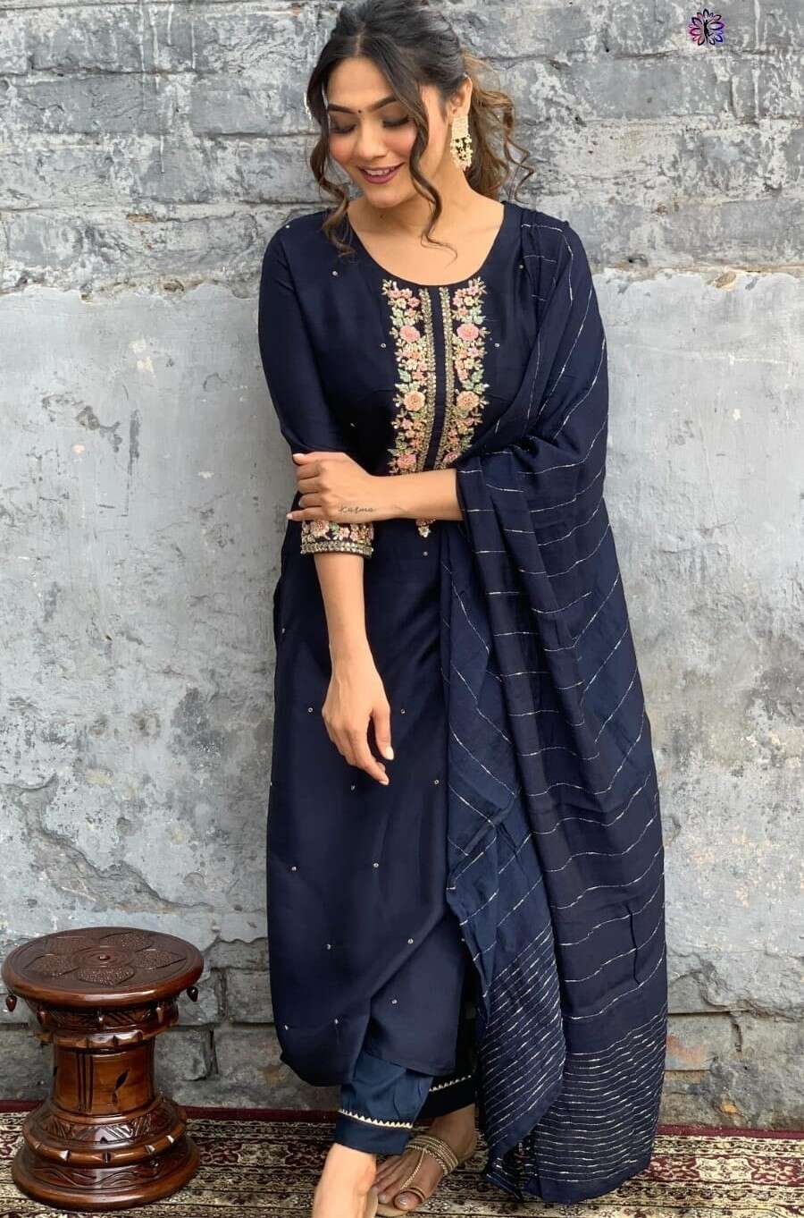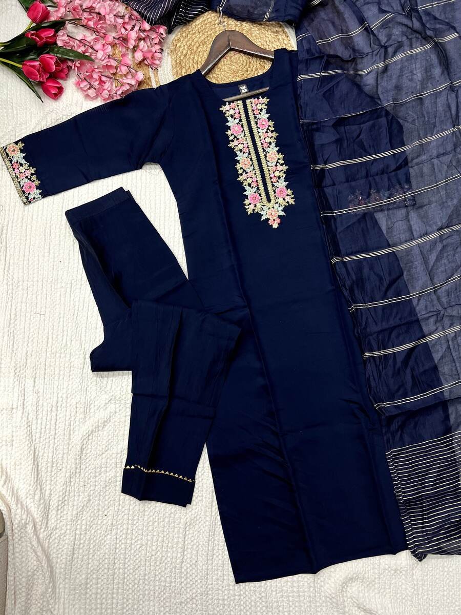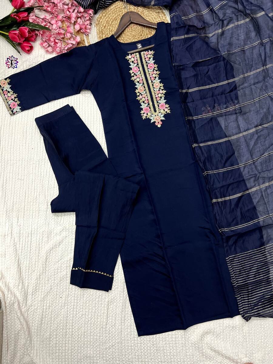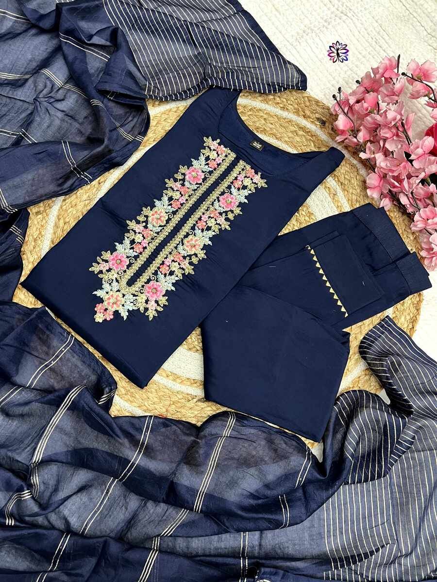 DESIGNER VISCOSE CHANDERI EMBROIDERY WORK TOP BOTTOM WITH DUPATTA NAVY BLUE