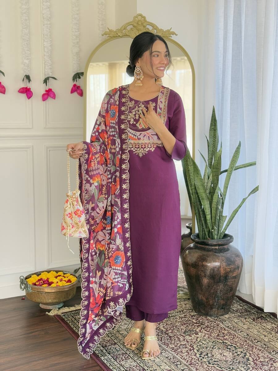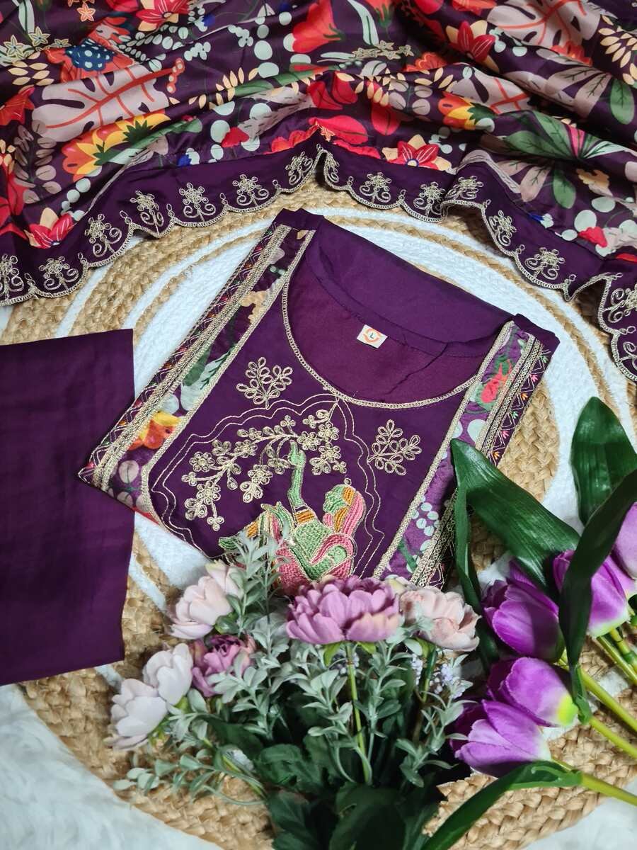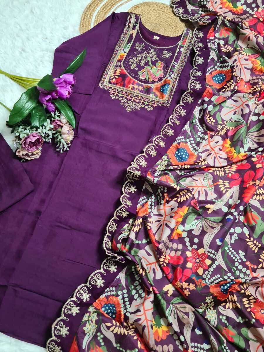 DESIGNER VISCOSE CHANDERI SEQUENCE CODING EMBROIDERY WORK TOP BOTTOM WITH DUPATTA PURPLE