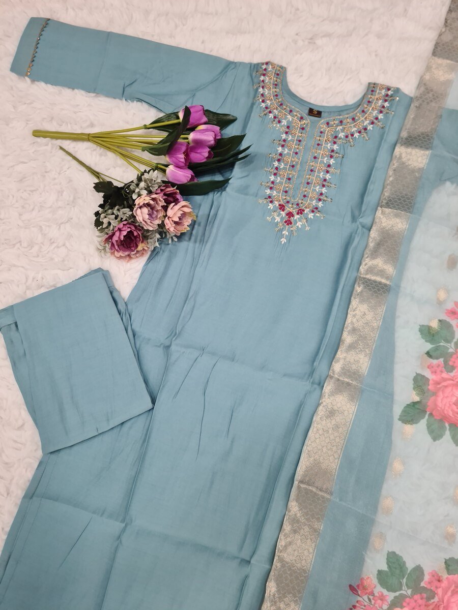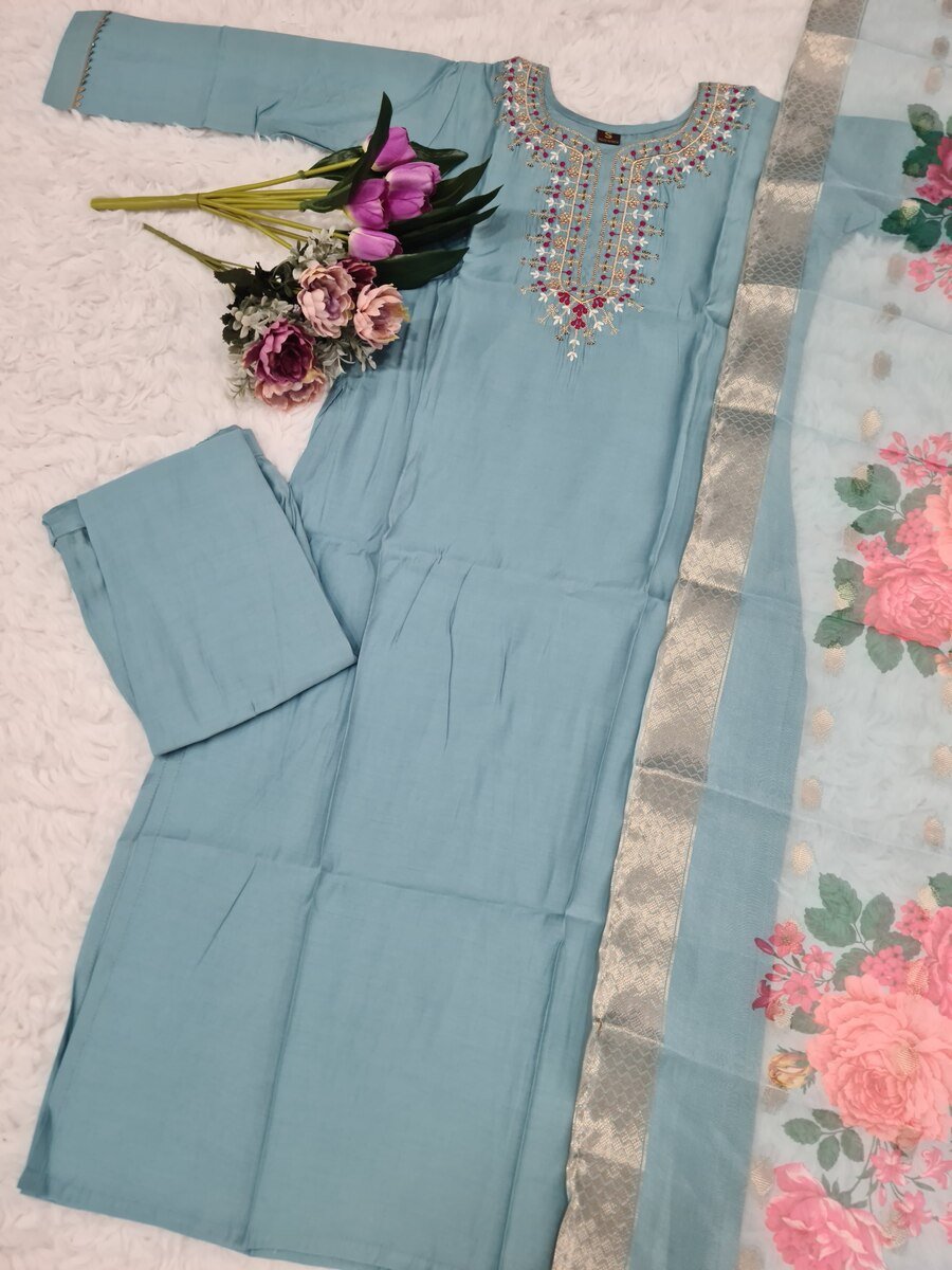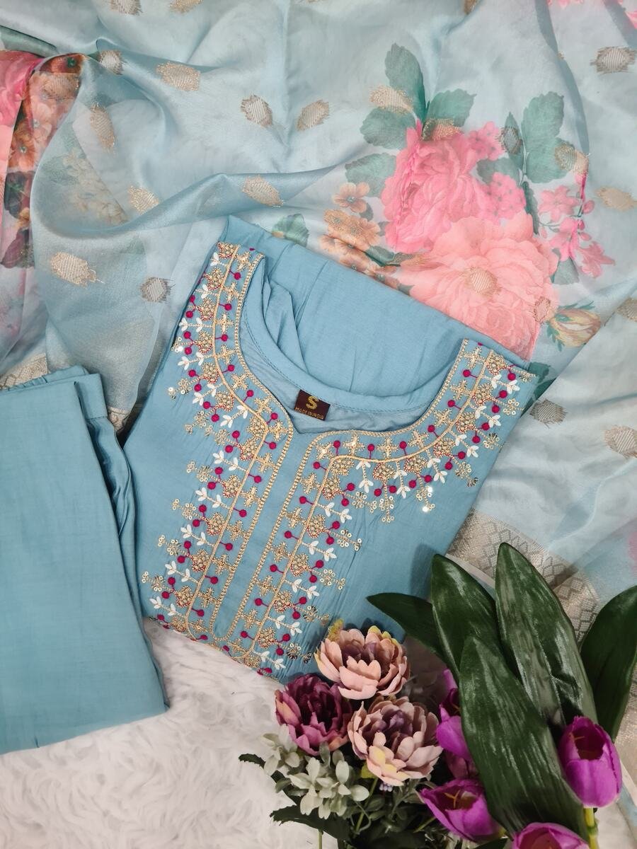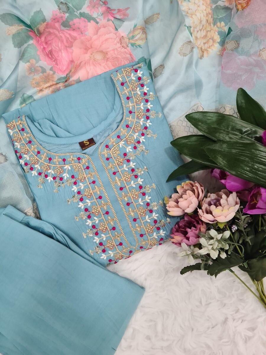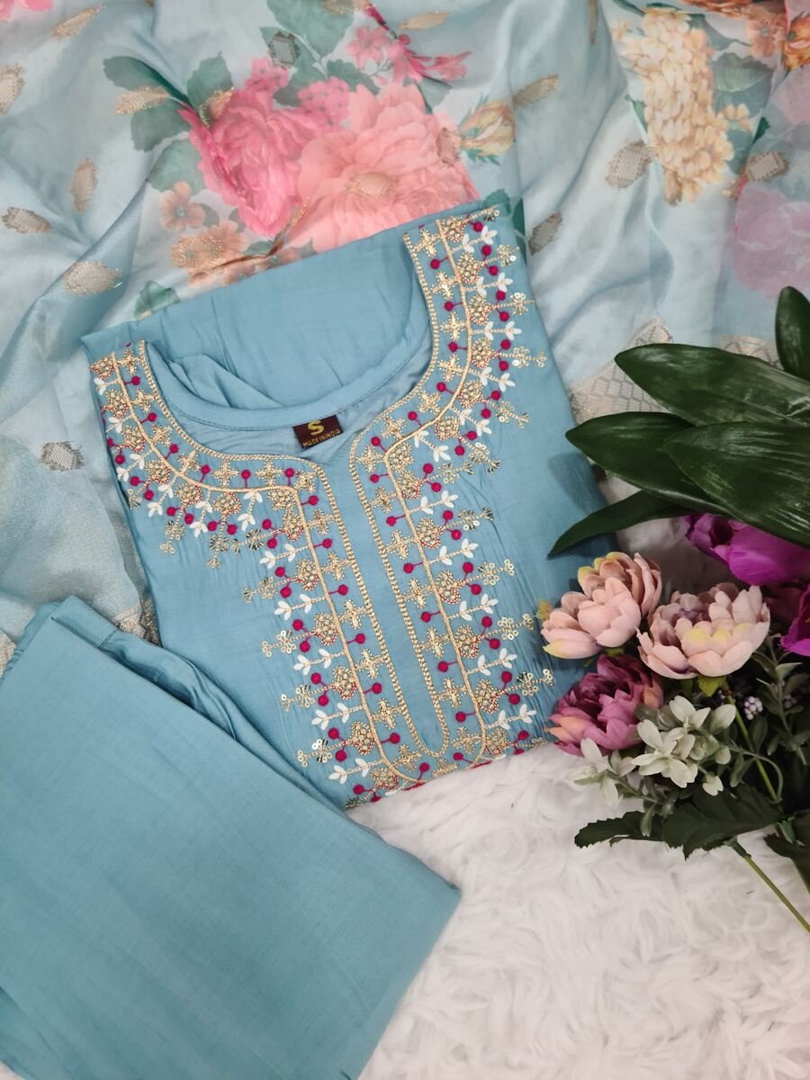 DESIGNER VISCOSE CHANDERI WITH SEQUENCE CODING EMBROIDERY WORK TOP BOTTOM WITH PRINTED DUPATTA SKY