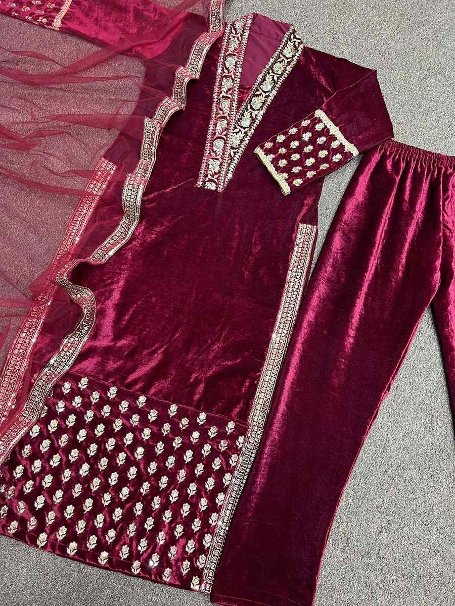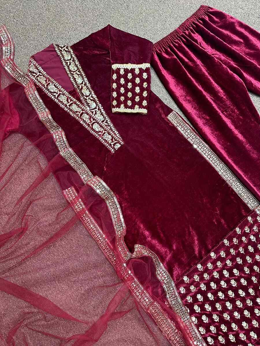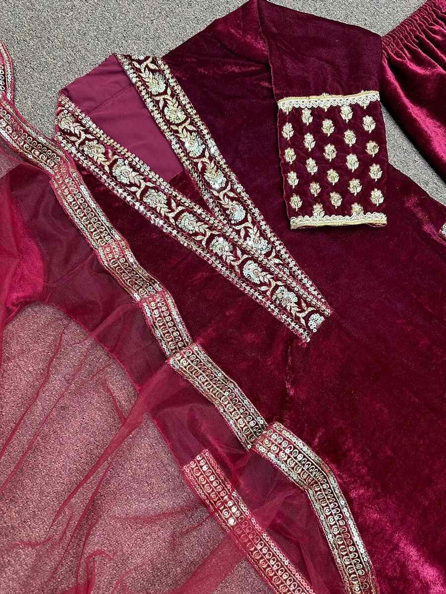 DESIGNER VISCOSE VELVET EMBROIDERY SEQUENCE WORK TOP BOTTOM WITH DUPATTA MAROON